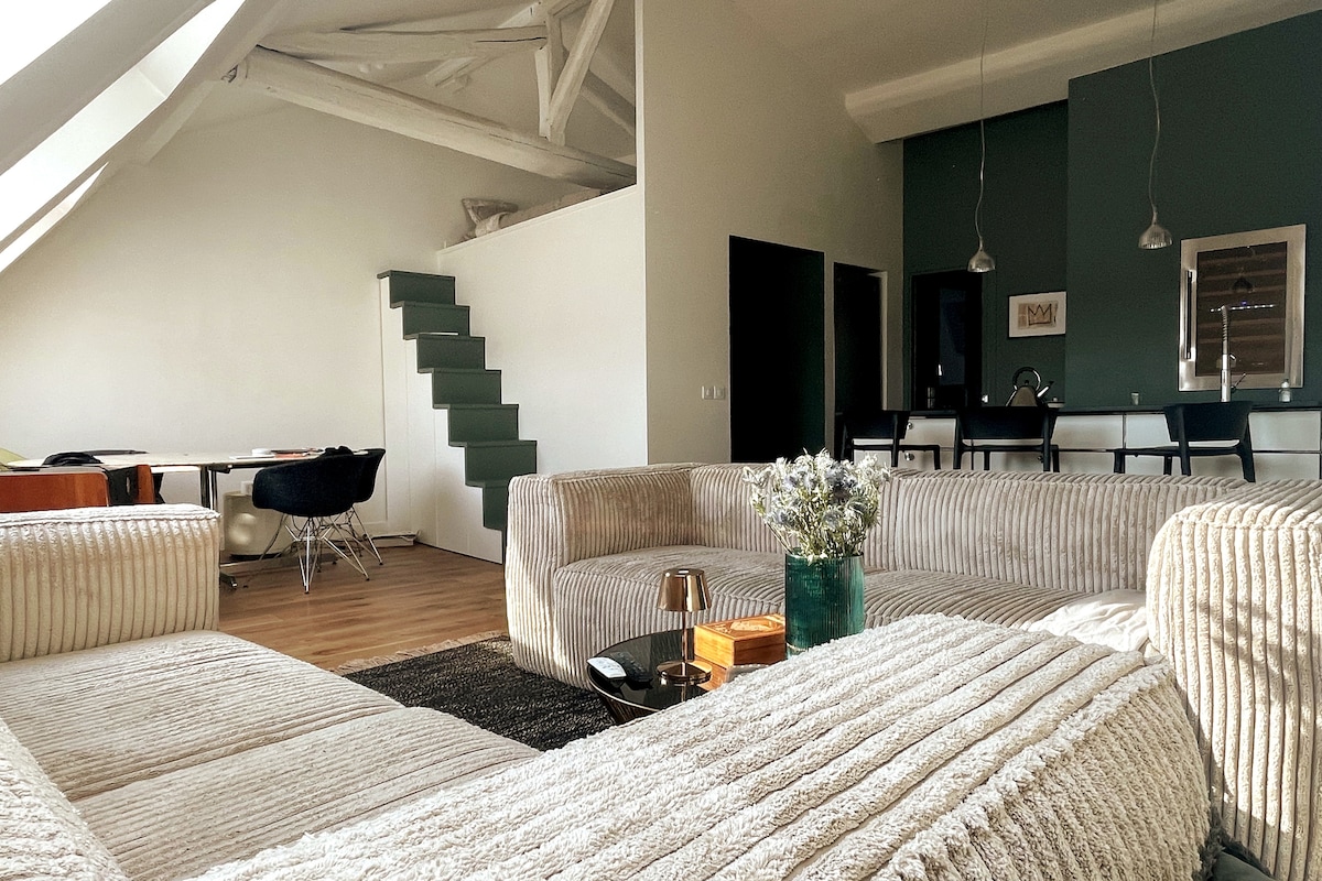 Il nostro appartamento è un ex laboratorio di cucito inserito in un edificio del XVIII secolo nel cuore di Parigi, a due passi da Montorgeuil e Les Halles. Si trova al 2° piano (non c'è ascensore). I travi a vista alti 3,30 metri e le pietre originali su una parete rendono il posto affascinante e luminoso. L'arredamento è soprattutto di design e alla moda, con qualche tocco vintage.