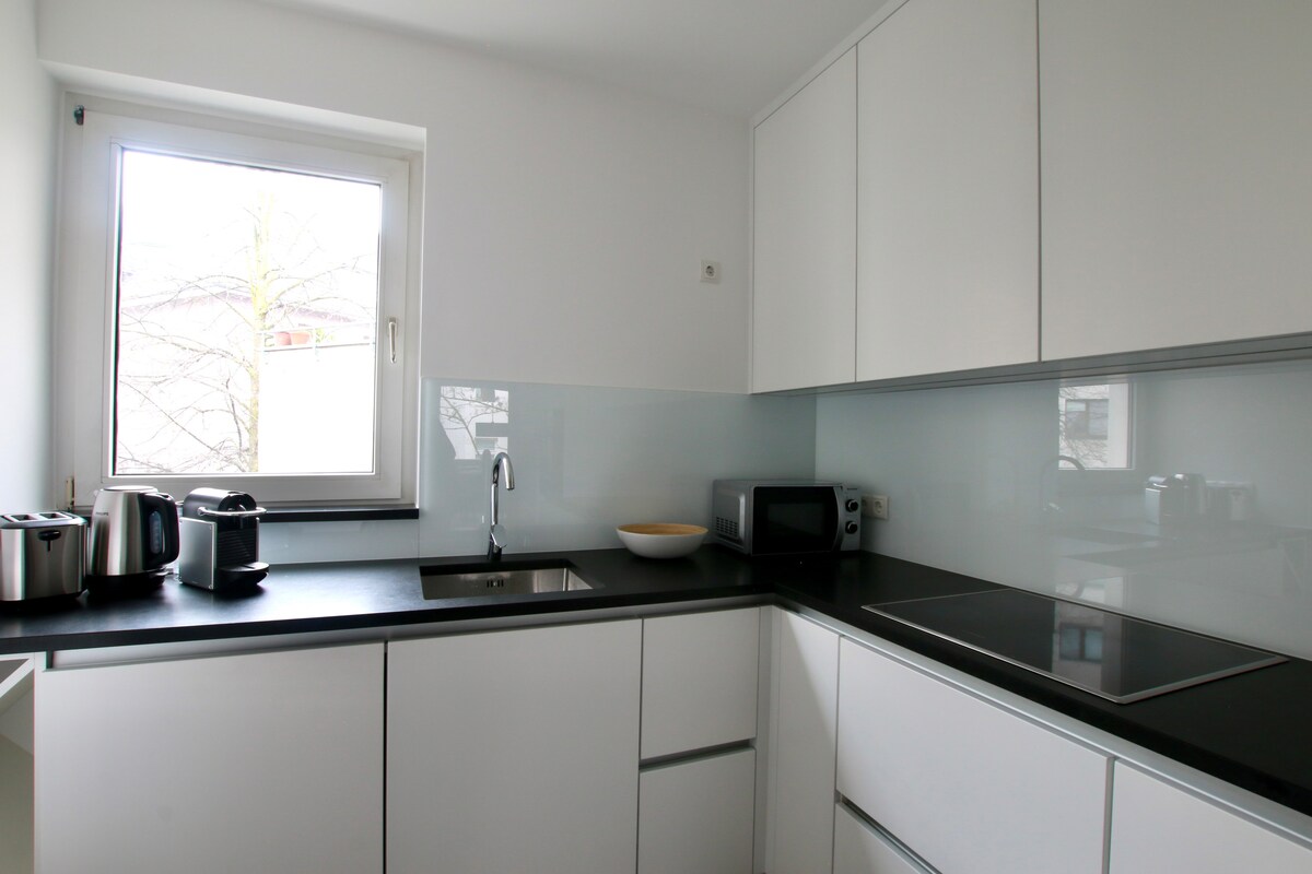 Recentemente ristrutturato! Monolocale bilocale luminoso, moderno e accogliente con bagno e mobili di design. Posizione centrale e tranquilla a Kwartier Latäng. La cucina è completamente attrezzata con congelatore separato, forno a microonde, forno, lavatrice, asciugatrice, radio Bluetooth, WiFi ad alta velocità da 500 Mbit, TV HD, lettore Bluray. Circondato da bar, piccoli teatri, cinema e supermercati vicino a Rudolfplatz e Belgisches Viertel, è perfetto per un breve viaggio a Colonia o per affari. 100% elettricità verde