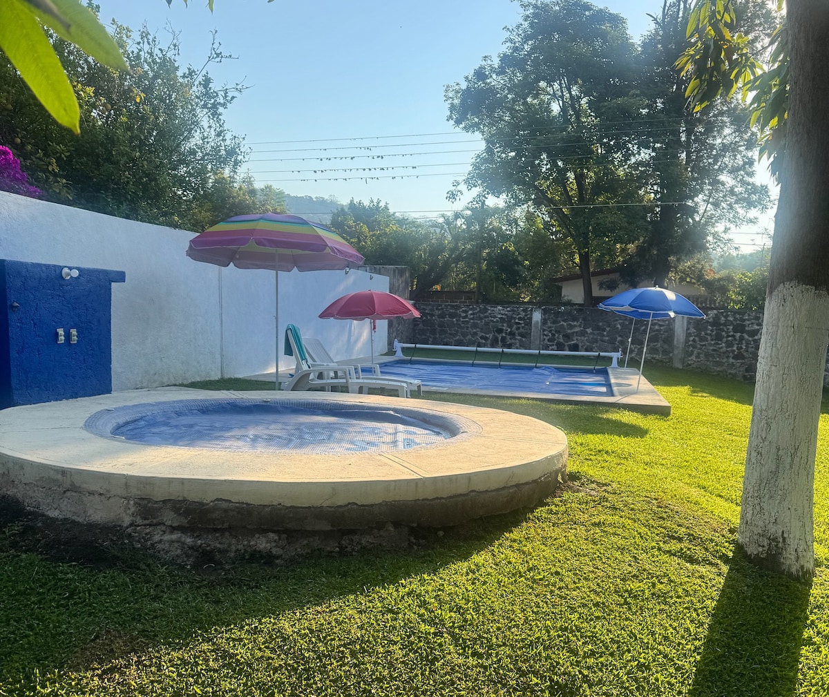 Divertiti in questa splendida tenuta ad Acamilpa, Morelos. L'intera struttura è PRIVATA con piscina, casa, aree verdi. Non ci sono spazi condivisi con nessun altro, solo le persone che affittano la casa vivono insieme. Molto vicino all'HACIENDA ACAMILPA WiFi!! in tutta la casa per fare home office È perfetto anche per un weekend con gli amici con palapa con barbecue. Disponiamo di un parcheggio per 8 auto all'interno della tenuta. A settembre, ottobre ci sono luciernagas e rospi!!!