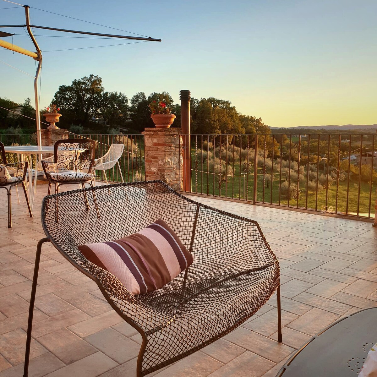 Camera Ulivo è un’accogliente stanza matrimoniale con vista spettacolare sulla valle umbra e i cipressi. Letto in ferro battuto, pavimento in cotto e soffitto in legno restaurato si uniscono ad arredi d’epoca e dettagli unici come una radio antica. Il bagno, raffinato e artigianale, include un lavabo in pietra su travi di legno antico e una doccia a cascata con piastrelle storiche. Tradizione e bellezza autentica.