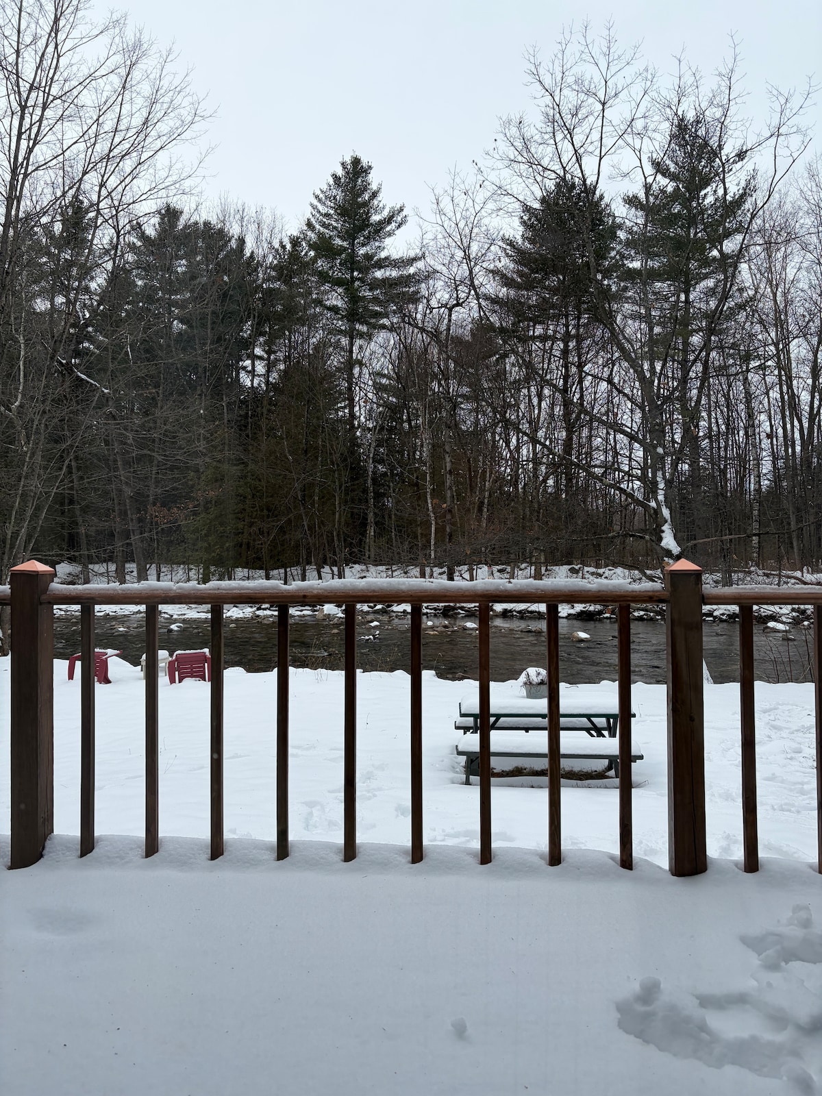 Accogliente baita in legno, vicino a un ruscello di trote adiacente alla foresta nazionale di Green Mountain. Pavimenti in legno massello d'acero, tappeti persiani, camino e stufa a legna. Un ampio soggiorno/sala da pranzo/cucina con piano di lavoro in granito/2 soppalchi aperti, ciascuno con letti matrimoniali, più un divano letto matrimoniale estraibile. Bagno ristrutturato di recente/ doccia/ lavatrice/asciugatrice. Spazio di lavoro in studio separato con connessione internet ad alta velocità. Lo chalet si trova a breve distanza in auto dalle aree sciistiche di Mad River e Sugarbush