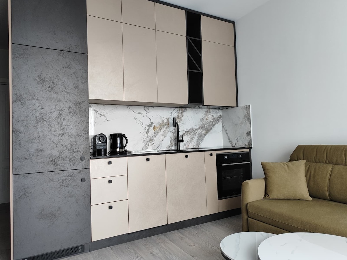 Ciao compagni di viaggio. Vi offriamo un nuovissimo monolocale in un edificio residenziale di nuova costruzione. La ristrutturazione è stata completata alla fine di maggio 2019. Dotato di elettrodomestici e servizi, l'appartamento offre TV a schermo ampio, aria condizionata, divano letto aggiuntivo in una zona salotto e un balcone per rilassarsi. Comfort e un'atmosfera accogliente, prelibatezze speciali per soggiorni più lunghi e un caloroso benvenuto ti aspettano. Da viaggiatore a viaggiatore, ti auguro un piacevole soggiorno.