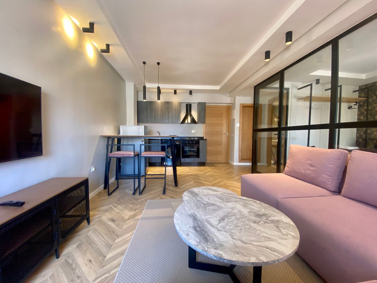 Ampio monolocale ultra moderno nel cuore della capitale. Composto da soggiorno, camera da letto, terrazza e cucina americana. Situato in posizione ideale all'agdal a pochi minuti a piedi da tutti i servizi (ristoranti, centro commerciale, trasporti) in un edificio autentico del quartiere. L'appartamento è stato ristrutturato a nuovo e dispone di tutto ciò che serve (wifi, TV, aria condizionata, parcheggio sotterraneo gratuito). Offriamo un servizio navetta a pagamento per l'aeroporto (Rabat 250dh, Casablanca 750dh)