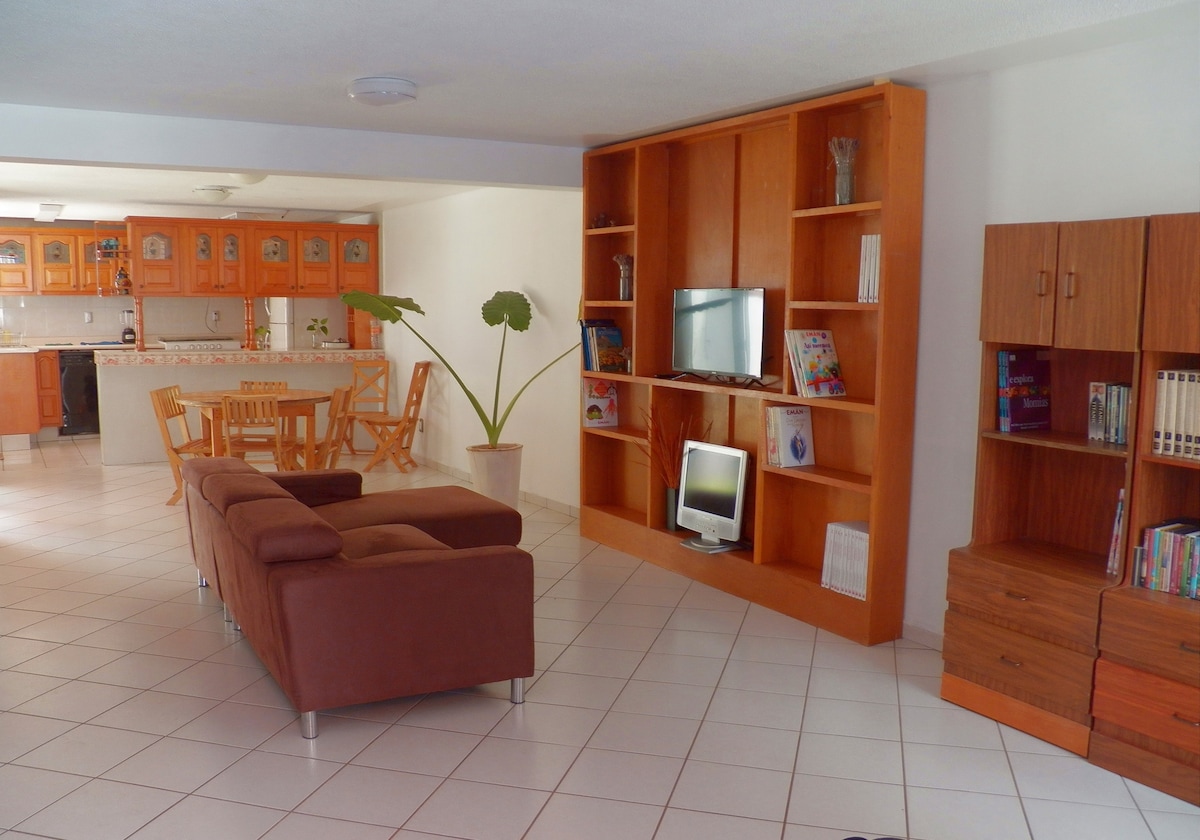Disfruta con tu familia, amigos o compañeros de trabajo la sencillez de este alojamiento en un lugar céntrico. A solo unos pasos de las instalaciones de la Feria, esta ubicado dentro de una privada, con estacionamiento, seguridad con portón eléctrico. cuenta con wifi y sistema de tv cable. Dos habitaciones con camas matrimonial cada una, cocina equipada, cafetera, Microondas y refrigerador. Con boiler instantáneo, sala y comedor, acogedor para relajarte durante tu estancia.