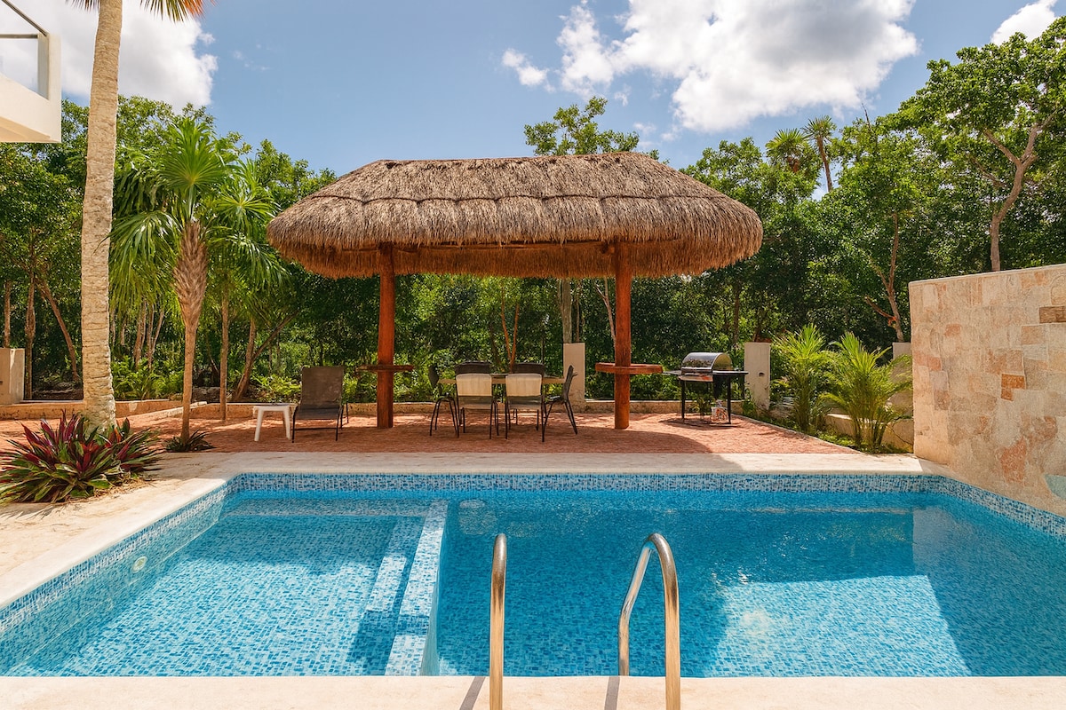 Jungle Oasis Loft w/ Private Plunge Pool & Terrace! Escape to this stylish 2nd-floor loft with a private terrace & plunge pool overlooking lush jungle views! Enjoy free bikes during your stay, a fully equipped kitchenette, and 24/7 security for peace of mind. Designed for couples, solo travelers & digital nomads, this modern retreat is cozy,quiet,and surrounded by nature just 15 min from the beach & downtown! Relax in your kingsize bed, dip in your pool,or explore nearby cenotes,beaches & more!