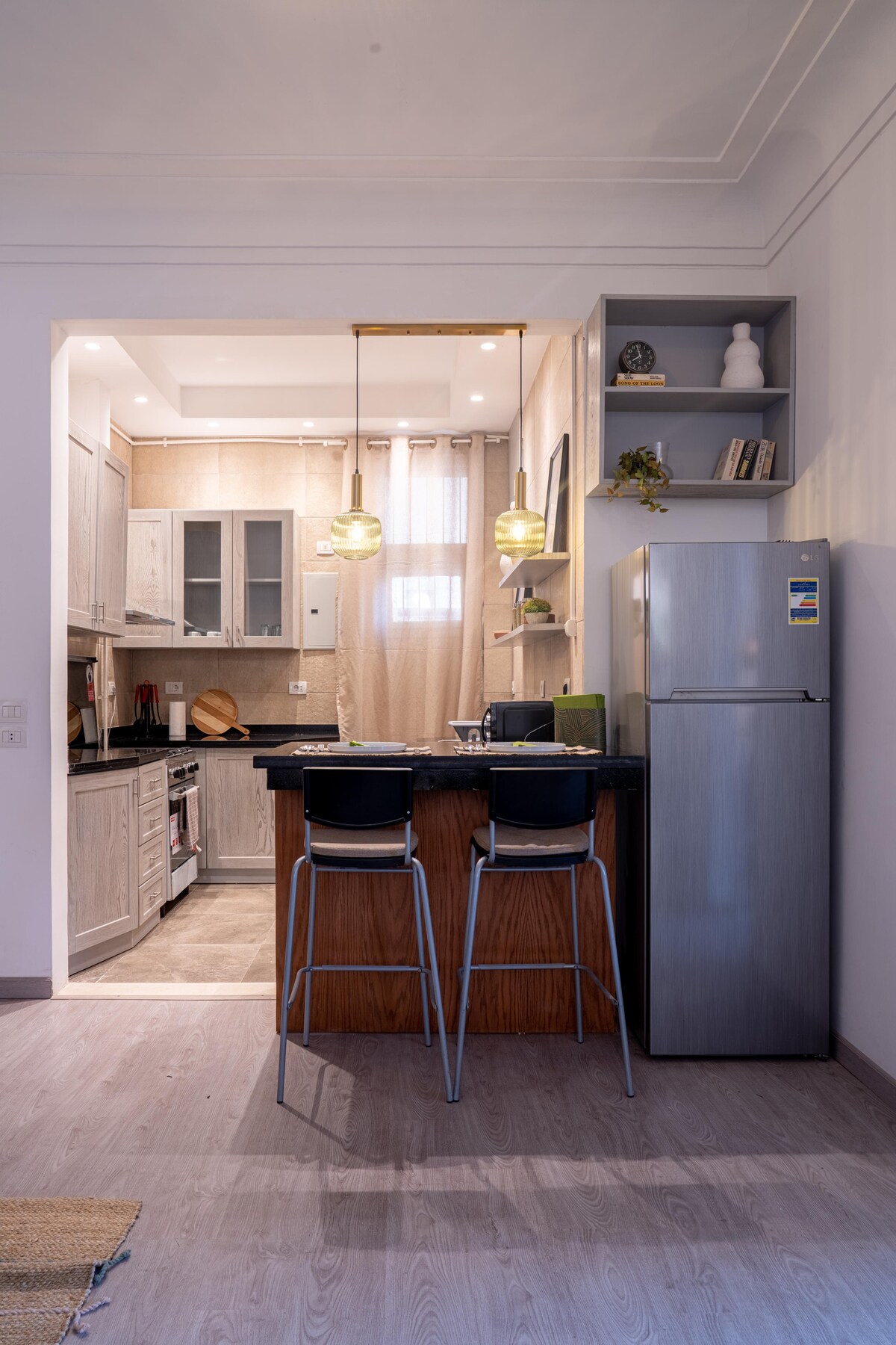 - 1611 y Haven Hospitality - Experience modern comfort in the heart of Zamalek, Downtown Cairo, at 1611 — a newly renovated and furnished 2-bedroom, 1-bath fifth-floor serviced apartment. Thoughtfully designed, it features a fully equipped kitchen and a private balcony with seating and city views. Perfectly located in the heart of Zamalek, steps from top cafés, galleries, and the Nile. Sleeps up to 4 guests.