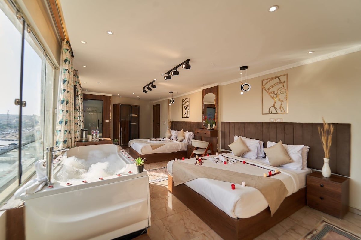 Una suite romantica affacciata sulle Grandi Piramidi, dotata di camera da letto principale con bagno privato, vasca freestanding con vista panoramica, ampia zona giorno e cucina completa aperta su una zona pranzo. Goditi la tua terrazza privata sul tetto sotto le stelle, perfetta per le coppie e per indimenticabili momenti di luna di miele. L'unità si trova a pochi minuti sia dal Nuovo Grande Museo Egizio che dal nuovo ingresso (Grande Porta) del complesso delle piramidi di Giza