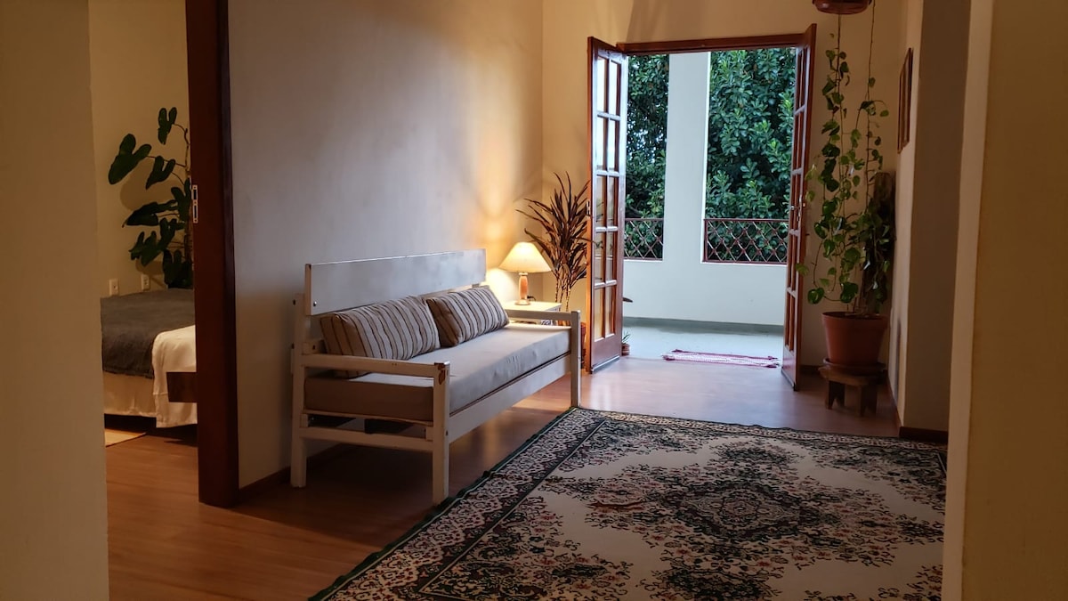 Ampia casa in una regione pianeggiante della città, con una posizione eccellente, a soli 5 minuti a piedi dal Centro. Situato nel quartiere Guararema, è anche vicino al campus UFES. L'ambiente è arioso, con tre camere da letto (una grande, una media e una piccola), tutte con ventilatore a soffitto, salotto con tv e balcone fronte strada, internet wi-fi, due bagni con blindex, zona di servizio con lavatrice e un piccolo spazio esterno sul retro. Non accettiamo animali domestici. Ambiente familiare.