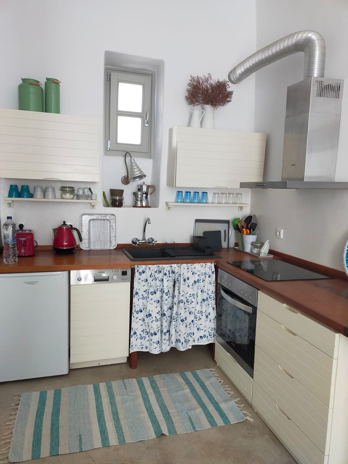 The Old traditional greek farmhouse is in a very private and quiet location. The house itsself is very rustic, simple and has a minimal style. The Farmhouse has one master bedroom with a bathroom with a shower, another double bed that connects with the living aera, a nice kitchen and another bathroom with a toilett only. It has a spacouse terrace with an amazing Seaview over the bay of Agios Pavlos. The beach of Agios Pavlos is a 2 min walk away and Aegiali port a 10 min car/bus drive.