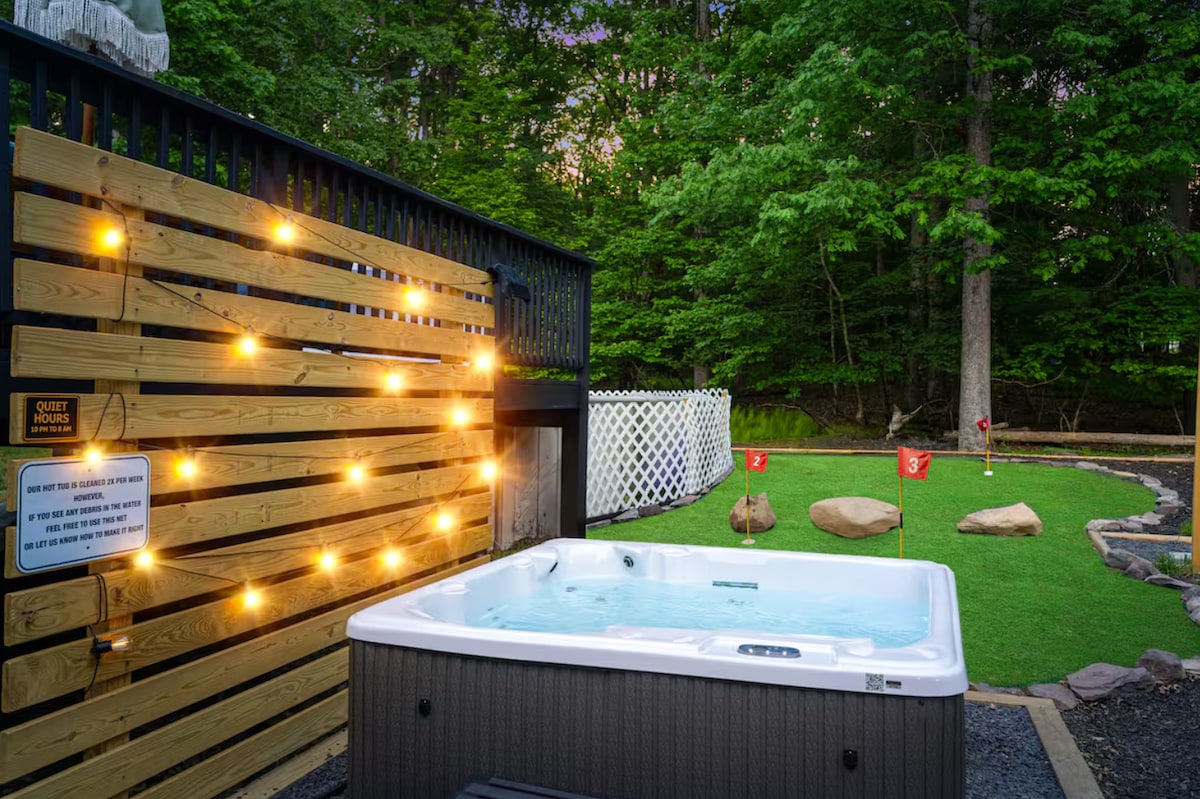 Step into your private Backyard Oasis—featuring an LED hot tub, two fire pits, a game room, outdoor gaming area, extra comfy hammock and a fully fenced resort-style yard built for unforgettable group getaways. Spend your days exploring the Poconos and your nights under the stars by the fire or soaking in the hot tub. With spacious living areas and room for everyone, this home is perfect for family vacations, friends getaways, and creating lasting memories together.
