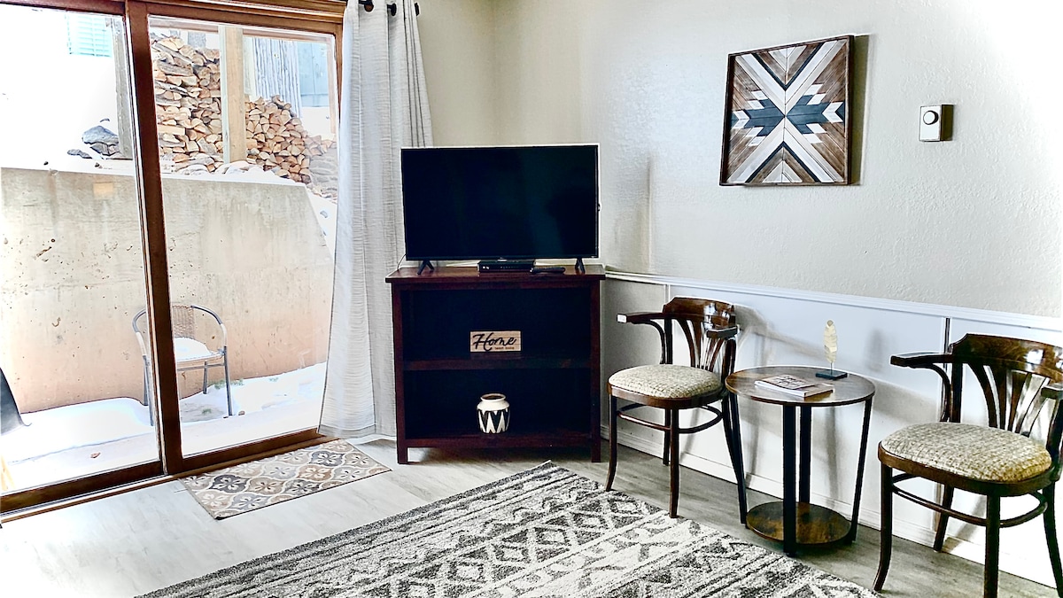 Nuovissimo appartamento 2Br/2B con un ampio concetto aperto. Primo piano. Situato a pochi minuti di auto dalle piste del resort Angel Fire. Il caminetto offre un fascino aggiunto all'ampia zona giorno. Goditi il tuo caffè mattutino nel patio con vista sulle piste. Il nostro patio al tramonto è allestito con vasca idromassaggio e il pozzo del fuoco e ha anche una splendida vista sulle montagne . Cucina completa, lavatrice e asciugatrice, WiFi gratuito. Può ospitare 6 persone.