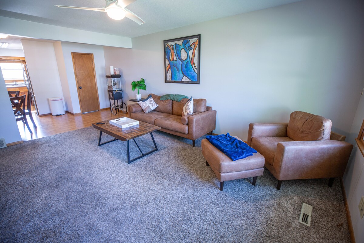 Grazioso appartamento seminterrato ristrutturato, situato in un quartiere tranquillo vicino alla I-35. L'appartamento recentemente ristrutturato dispone di una cucina completa con frigorifero, piano cottura, forno a microonde, lavastoviglie, macchina per il caffè e utensili di base per cucinare. Goditi un camino elettrico nel soggiorno. La spaziosa camera da letto dispone di un comodo letto matrimoniale e di un'ampia cabina armadio. Un divano letto a due piazze si trova nella sala comune. È disponibile un box per bambini. Goditi il tavolo da biliardo/ping-pong e la TV. Vicino al campo da golf pubblico.