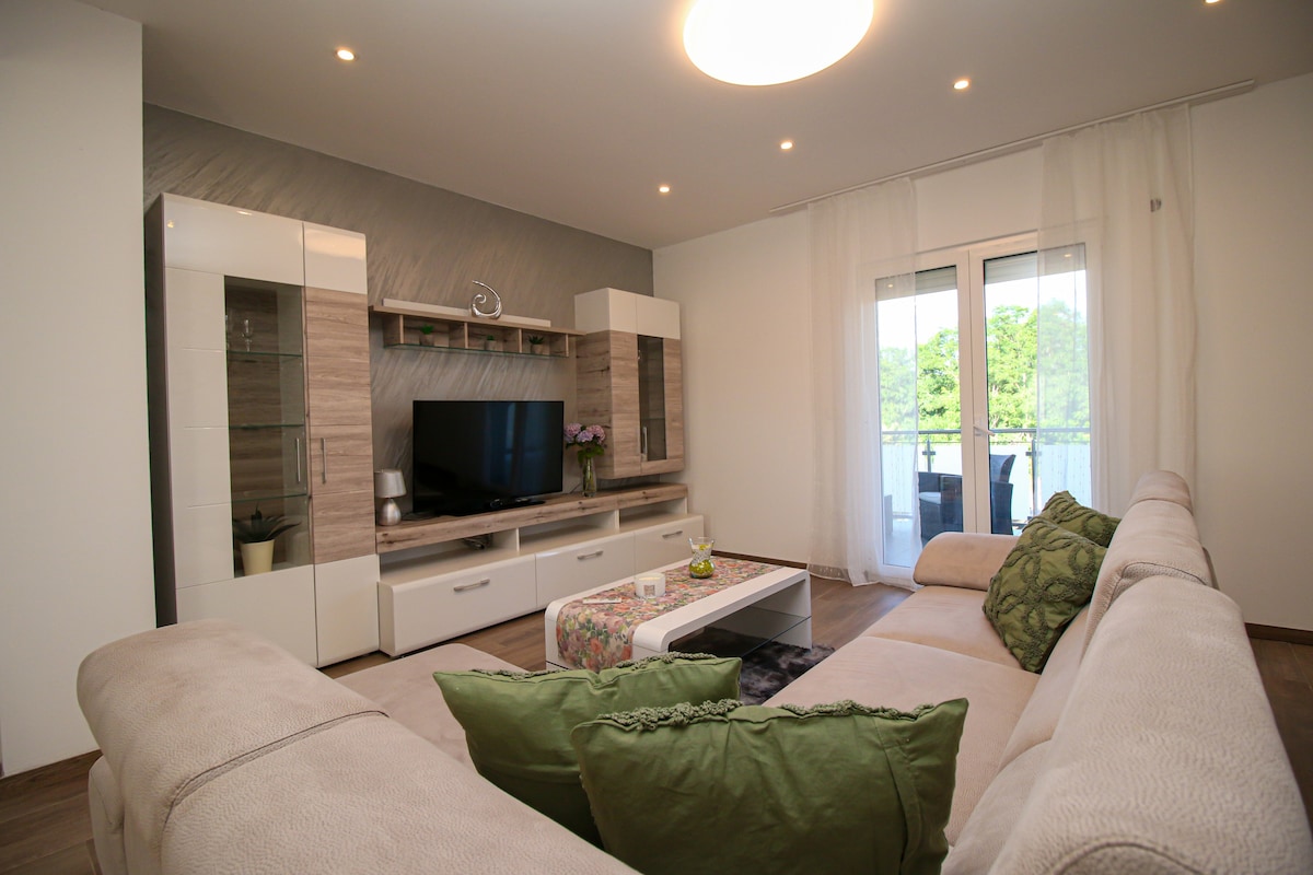 Trascorri le tue vacanze nel nuovo appartamento Vita. Elegantemente arredato, appartamento con tre camere da letto in una zona tranquilla di Parenzo, a soli 1500 m dalla spiaggia, e 2000 m dal centro storico vi delizierà con dettagli moderni e decorazione che soddisferanno tutte le vostre esigenze per una vacanza ben meritata. Due camere da letto, due terrazze, un soggiorno a pianta aperta con sala da pranzo e cucina e un comodo bagno offrono spazio sufficiente per 6 persone.