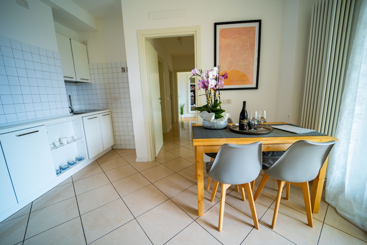 Appartamento moderno e accogliente con parcheggio privato recintato gratuito, garage per bici e giardino con BBQ / Gazebo. Situato al 2° piano con ingresso autonomo, ha 2 stanze con 2 posti letto ciascuna, open-space con cucina e soggiorno con divano letto matrimoniale, bagno con finestra e ampio balcone vista montagne perfetto per prendere il sole, mangiare all'esterno e godersi il panorama. È attrezzato di lavastoviglie, lavatrice, macchina Nespresso, Wi-Fi e Smart TV. Ospita fino a 6 persone.