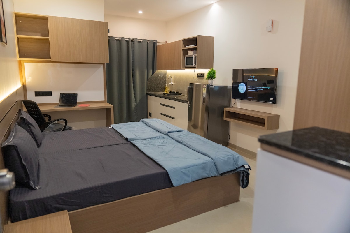 BLUO STAYS - Award winning Homes! Private Studio in heart of city at Koramangala. Ideal for Single Guests & Couples - short drive from HSR Layout, Indiranagar & Bannerghatta Road. Spacious, non-sharing Studio with Balcony, Designer Bed, Work Desk, Bathroom & Kitchenette with Cooktop, Fridge, Microwave, cookware etc, plus Terrace Garden with al-fresco seating. All-inclusive Daily Rental - WiFi Internet, Netflix/Prime, Cleaning, Washing Machine, Utilities, 100% Power Backup,Lift.