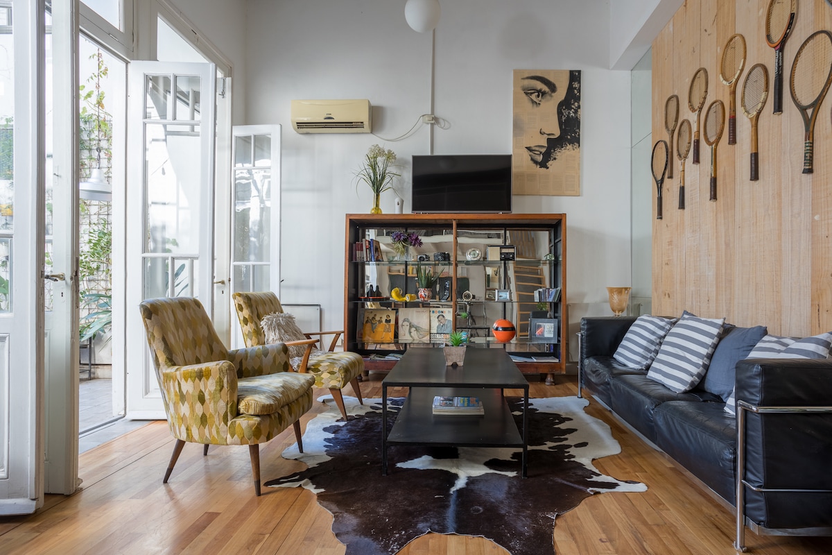 Vale la pena salire 4 rampe di scale in marmo per raggiungere questo rifugio luminoso e arioso. Trascorri una serata su una terrazza a scacchiera con un barbecue da un lato e una romantica vasca idromassaggio dall'altro. Scegli un libro da leggere più tardi o vai direttamente al comodo letto 2x2m. A 2 minuti a piedi dalla linea della metropolitana che collega al centro della città. Recoleta e Palermo sono raggiungibili a piedi. Non c'è ascensore per raggiungere il loft. L'uso della vasca idromassaggio in inverno non è consigliato. Non dispone di un proprio riscaldatore, anche se può essere riempita con acqua calda, e si raffredda molto rapidamente durante l'inverno.