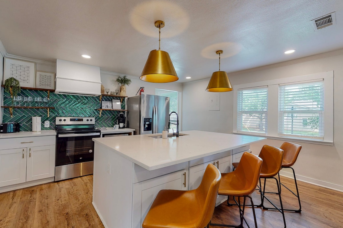 Professionally cleaned to high standards, including door knobs and light switches. Stay in your own “gallery” just a short walk from restaurants and shops at Bishop Arts! Recently updated with plush beds, a kitchen with gas range and granite counters, living room with 55" smart TV, and a modern bathroom with walk-in shower. All art is original by local artists and available for purchase—take a piece of Dallas home with you!