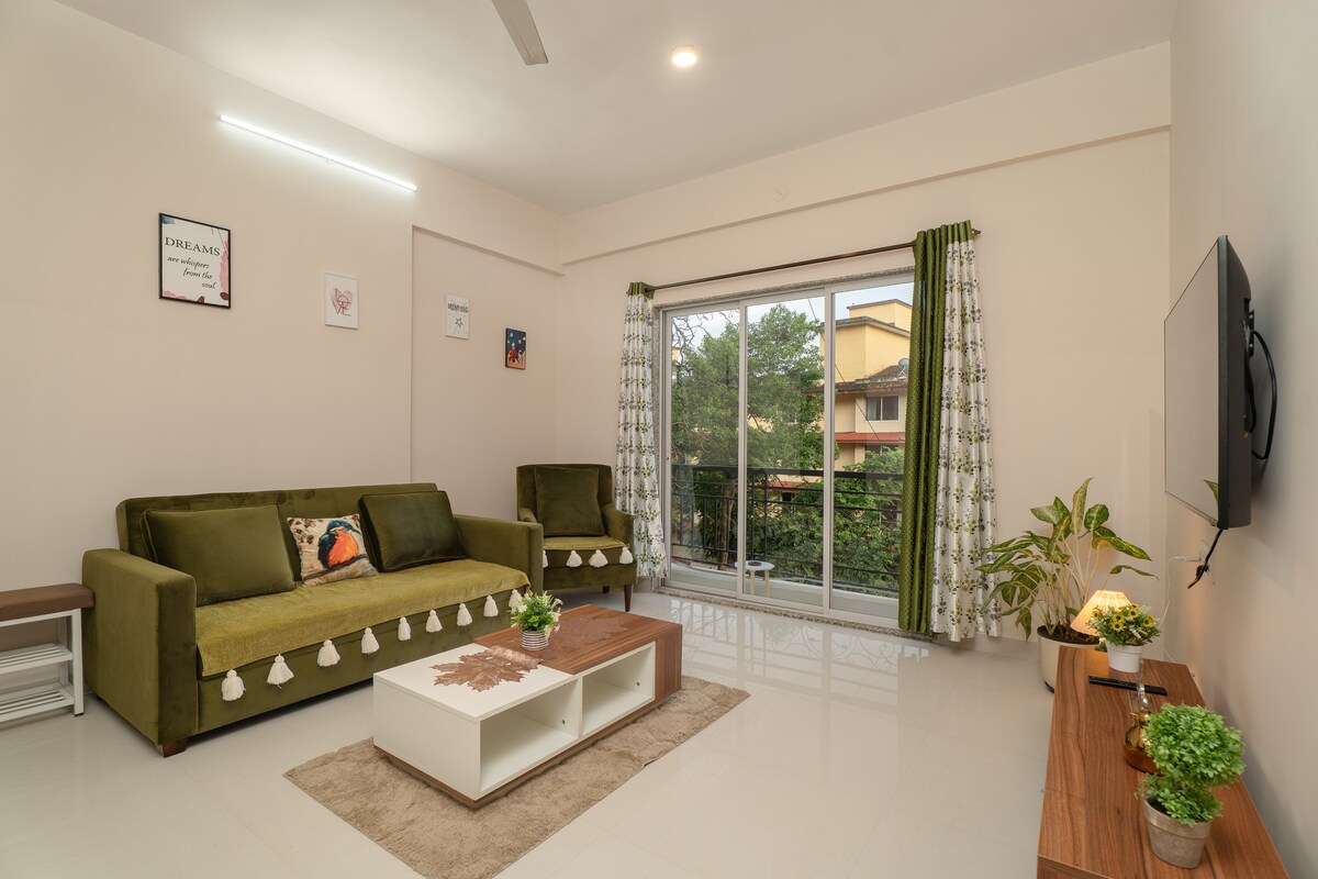 Ti diamo il benvenuto nella nostra casa curata con tutto il nostro amore, per farti sentire la serenità e il lusso che proviamo anche noi. Immerso in un pittoresco "Waddo" nella vivace zona balneare di North Goa, il nostro appartamento riempie tutte le stanze di luce naturale e venti freschi che si aprono in una rinfrescante distesa verde. Sentiti come a casa nell'ampio soggiorno con cucina completamente attrezzata, le due camere da letto rustiche ma vivaci con bagni annessi e un ampio spazio privato per sedersi.