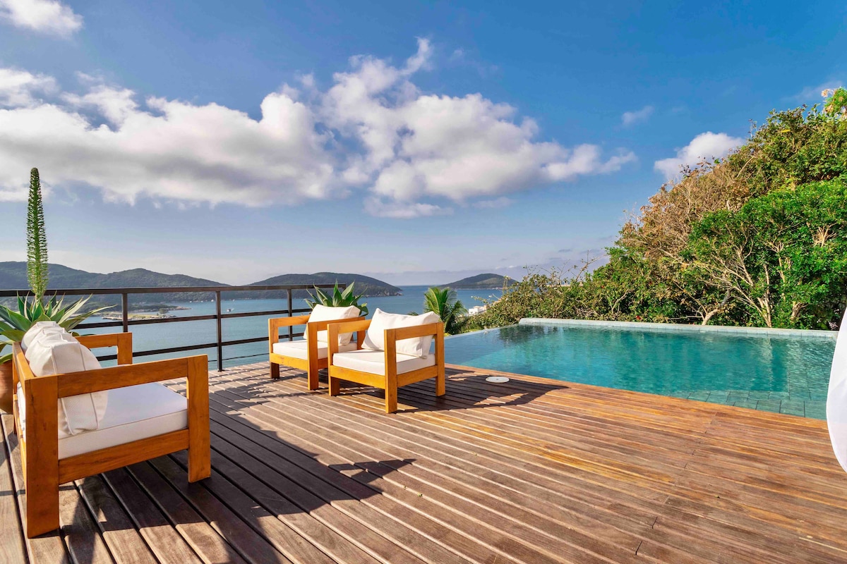 Una casa con una vista mozzafiato all'interno del Pontal do Atalaia, una zona nobile di Arraial do Cabo e lontano dal trambusto del centro. Suite climatizzata, soggiorno con ottimo divano letto, cucina completa, terrazzo con idromassaggio e barbecue e vista sul mare di Arraial do Cabo. La piscina privata e il barbecue della casa, con quella vista paradisiaca sul mare di Pontal do Atalaia. L'intera casa ha vista mare. Siamo a 2,5 km da Prainhas do Pontal do Atalaia.