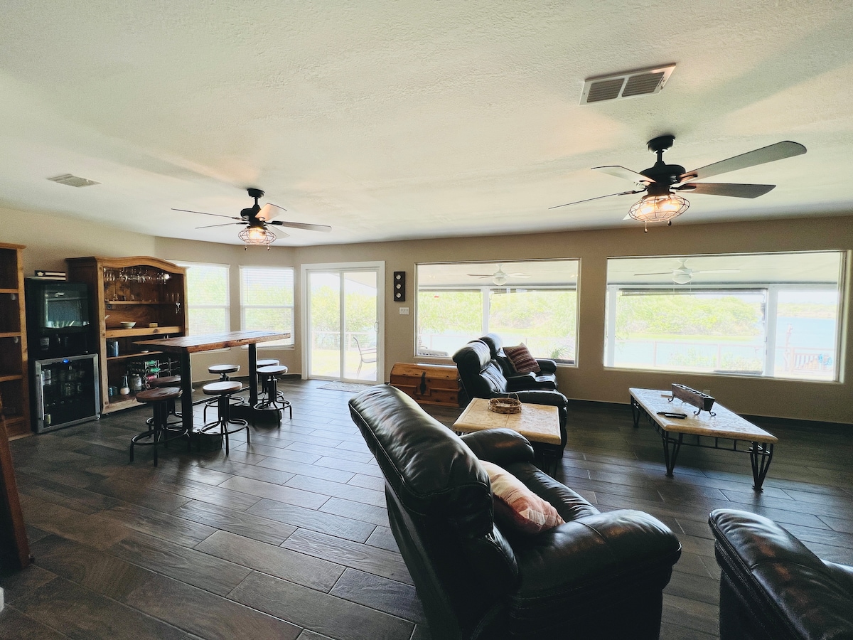 Easy-Breezy Cabin is a newly remodeled retreat designed for relaxation and fishing. The multi-level cabin features two bright comfortable bedrooms, two full bathrooms, a spacious kitchen, dining area, a TV room, and a breakfast nook that has a view of the Arroyo. The cabin has an outdoor space where guests can unwind. A spacious pier extends over the water with a clean-up area and sink for cleaning fish, covered seating, and two floodlights making it an excellent spot for night fishing.