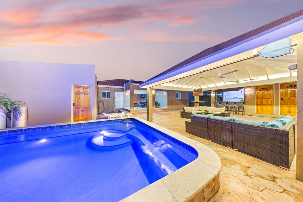 Escape to Reina Del Sol, a luxurious 5 bedroom private Villa in Bakval, Aruba. It features a grand pool, hot tub, 20-ft cabana, and a full outdoor kitchen with a professional Napoleon grill. Five spacious bedrooms with 5 bathrooms, an expansive living areas and a gourmet Italian kitchen (kosher-ready) with high-end appliances. While you can fully enjoy the luxury facilities, you are just a 10-minute walk to Aruba’s premier beaches between the Ritz and Marriott.