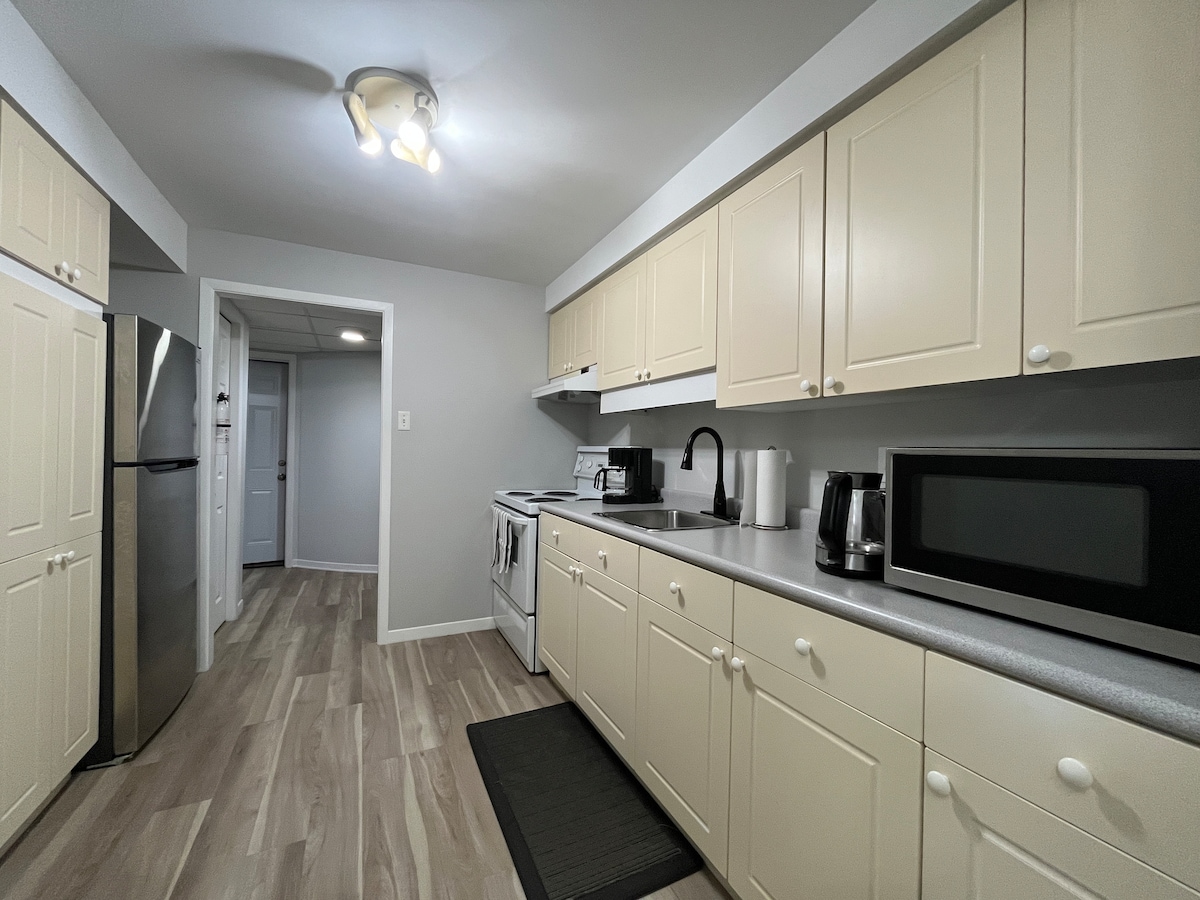 Abbiamo recentemente ristrutturato il nostro seminterrato per creare una suite per gli ospiti elegante, moderna, accogliente e tranquilla. C'è un ingresso laterale che si apre direttamente sulle scale che portano all'unità. Ha una porta esterna in metallo con serratura per l'insonorizzazione e la sicurezza. L'unità è un luminoso monolocale con tre ampie finestre, una cucina completa, una zona salotto con TV e camino, un tavolo da pranzo, un letto matrimoniale, una cabina armadio e un bagno privato con una doccia di 1,5 metri. Con ampia insonorizzazione!