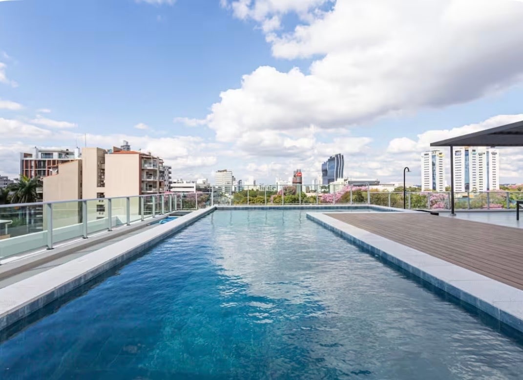 Departamento ubicado en un piso alto, con balcón y vista despejada, totalmente equipado para una estadía cómoda: - Cama king con colchón firme de alta densidad - Espacio de trabajo con escritorio y conexión WiFi - Smart TV de 55'' - Rooftop con piscina y gimnasio - Quincho - Lavandería - Seguridad las 24 horas Ubicación excepcional: - Situado en el Eje Corporativo, a solo 5 minutos del Shopping del Sol y Paseo La Galería - A 15 minutos del Aeropuerto Internacional Silvio Pettirossi