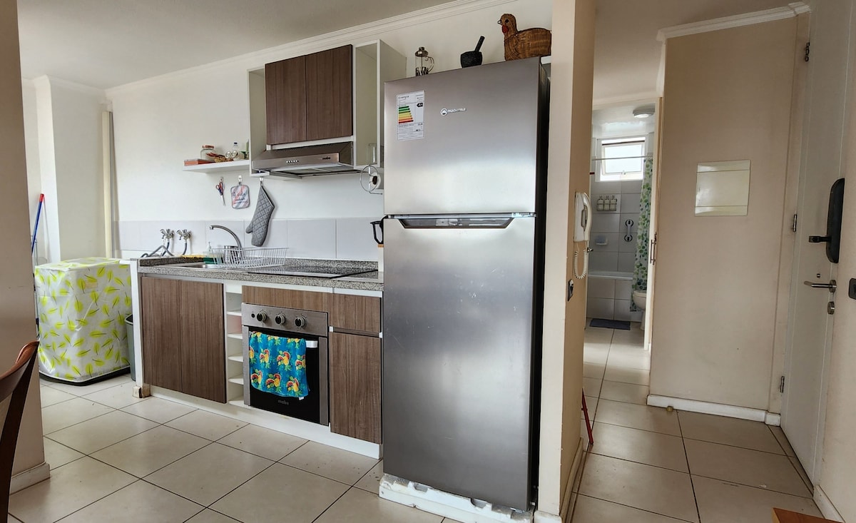 Appartamento a un isolato dal supermercato Líder e a 2 isolati da Jumbo, con un letto matrimoniale nella camera da letto principale, le altre 2 camere da letto hanno anche un letto, completamente arredato con un soggiorno, sala da pranzo, lavatrice e asciugatrice, cucina arredata al 100% con tutti gli utensili da cucina. Tutti i mobili sono in stile vintage. Dispone di parcheggio, Wi-Fi, TV via cavo, Netflix e Amazon Prime. Nel bagno troverai sapone, shampoo, balsamo, asciugamani puliti e un asciugacapelli.