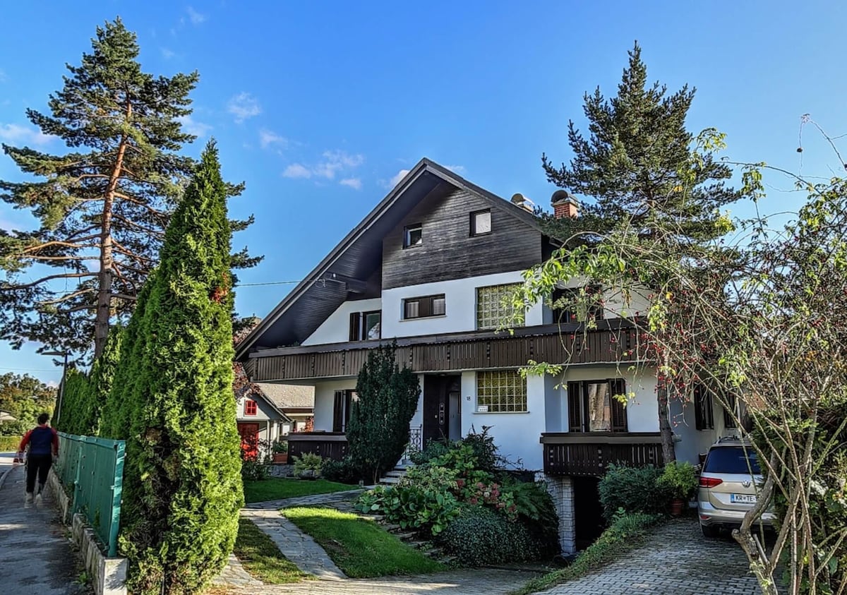 Splendidamente arredato, grande e dotato di tutti i comfort e i servizi che ci si aspetterebbe, l'appartamento offre tutto il necessario per un soggiorno tranquillo e molto confortevole in Slovenia. È lontano dal rumore e dalla folla, ma allo stesso tempo vicino a tutto. È il luogo perfetto in cui soggiornare mentre visiti il lago di Bled, il Parco Nazionale del Triglav o le Alpi slovene! L'appartamento occupa l'intero piano superiore e dispone di 3 ampi balconi con panorami spettacolari.