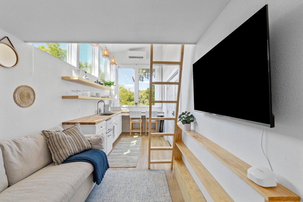 Explore Austin from this fabulous tiny home in the heart of the trendy East Side! Big style in a small space with everything you need for a cozy stay. Walk to tacos, cocktails, and coffee, then unwind in your own cute retreat. Whether you’re city-hopping or tiny-living curious, this fun little spot makes the perfect home base! – Kitchenette (fridge, stove, microwave) – Queen lofted bed – Smart TV & desk – Free off-street parking – Walk to some of the best of Austin