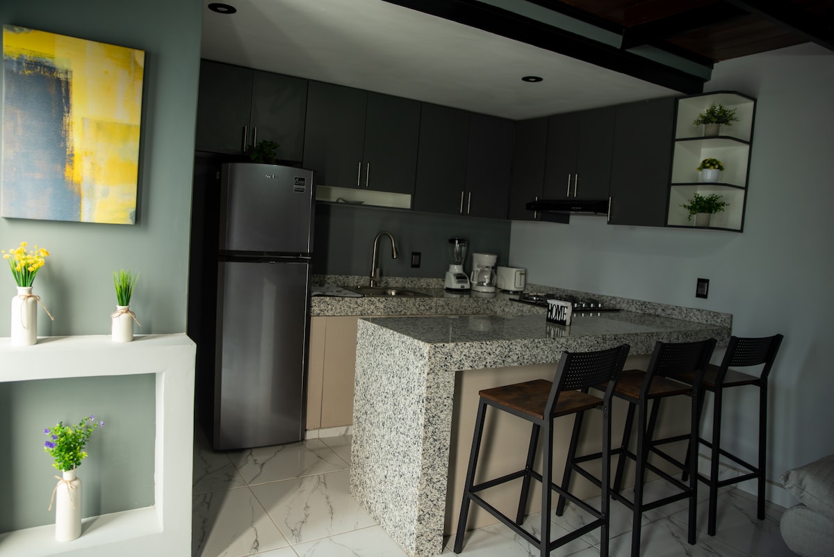 Confortevole appartamento per un piacevole soggiorno. Ha una buona illuminazione e ventilazione. Situato di fronte a un'unità sportiva. Luoghi vicini; palestra, negozi di alimentari, centro sanitario, farmacia, lavanderia, bancarelle di cibo e chioschi. Ingressi e uscite rapidi sulle varie strade. Dispone di: Camera con letto king size e aria condizionata. Sofacama. Cucina con grill e minibar (con gli elementi essenziali per cucinare). Acqua calda tramite riscaldatore solare.