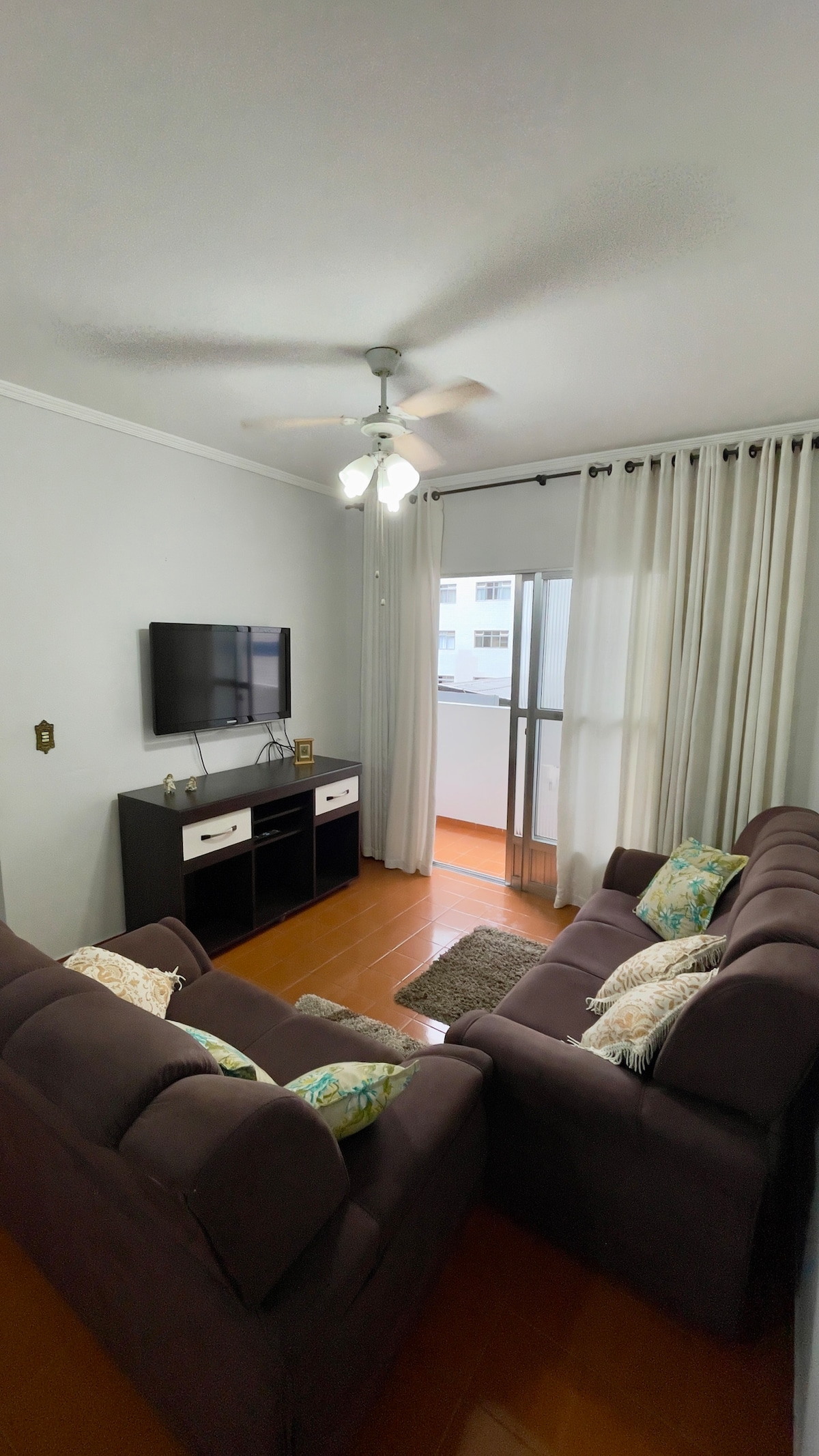 Ap con 2 camere da letto e balcone nel quartiere Canto do Forte, il quartiere più esclusivo di Praia Grande, a 350 m dalla spiaggia e a 600 m dall'Av più popolare della regione (Marechal Mallet). *Forniamo biancheria da letto* - Al 2 piano con ascensore 1 posto auto coperto (ROTANTE) - Massimo 6 ospiti - Fiber Wi. - TV - 1 letto matrimoniale - 2 letti singoli - 1 materasso matrimoniale aggiuntivo - Cucina completa - Ventilatore a soffitto in ogni stanza