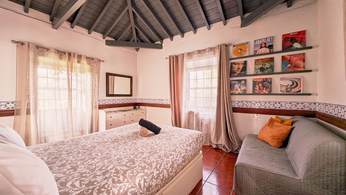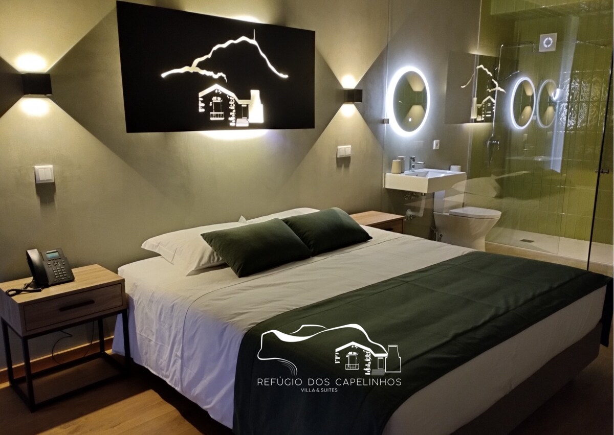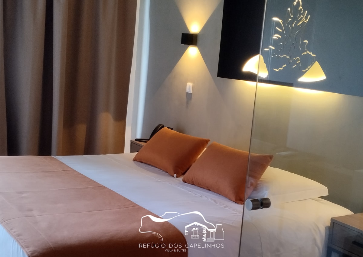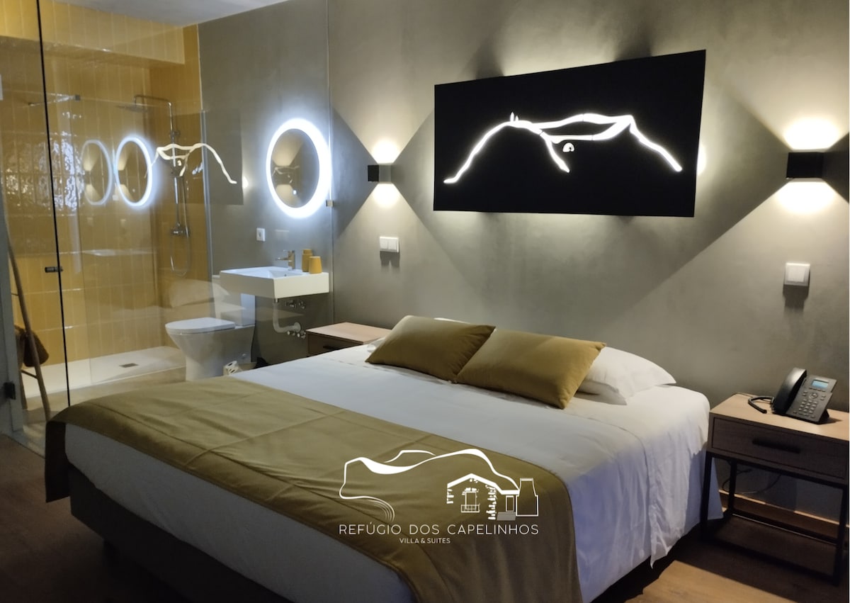 Assolutamente sbalorditiva, questa camera con la sua incredibile vista a 180° sul monte Pico e sull'isola di Faial. Anche il bagno privato si affaccia sulla montagna! Questa camera di lusso è perfetta per una fuga romantica nella bellissima isola di Pico. La luce che entra da ogni angolo è perfetta per scattare foto incredibili.