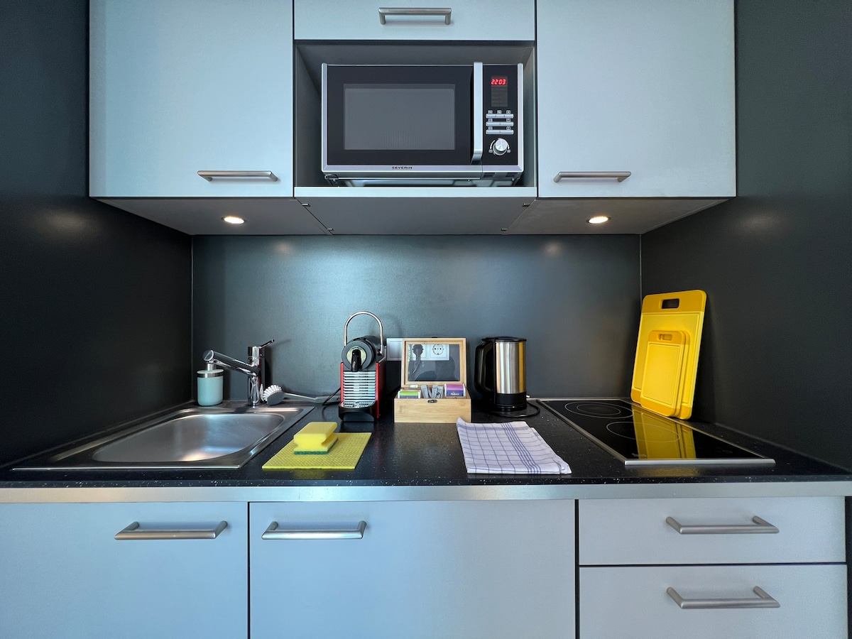 Are you looking for a stylish apartment for little money? Close to the city and hotel-style service? Then you'll feel right at home in this apartment in Karlsruhe's Oststadt district! The apartment is fully equipped with a 1.40 m bed & fitness room in the building. ➤ 24/7 self-check-in with PIN code ➤ Fully equipped kitchen + Nespresso machine & coffee bar ➤ Fast WLAN (>100 MBit/s) ➤ Ultra-HD 4K TV with Netflix ➤ Modern retro design ➤ Terrace ➤ Relaxing rain shower ➤ Underground parking garage
