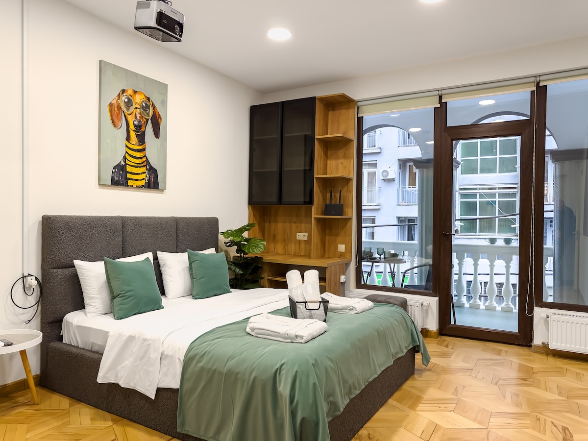 Elegant studio in Saburtalo, Archil Tsagareli 50, featuring a separate kitchen and private terrace with stylish seating. Located on the 3rd floor (accessible like 2nd). Enjoy a high-definition projector, induction stove, microwave, dining area, and designer tableware. Rest on a premium orthopedic bed and benefit from smart lock entry, workspace, robes, fresh linens, towels, toiletries, iron, vacuum, and hair dryer — a refined, comfortable retreat designed for modern living.