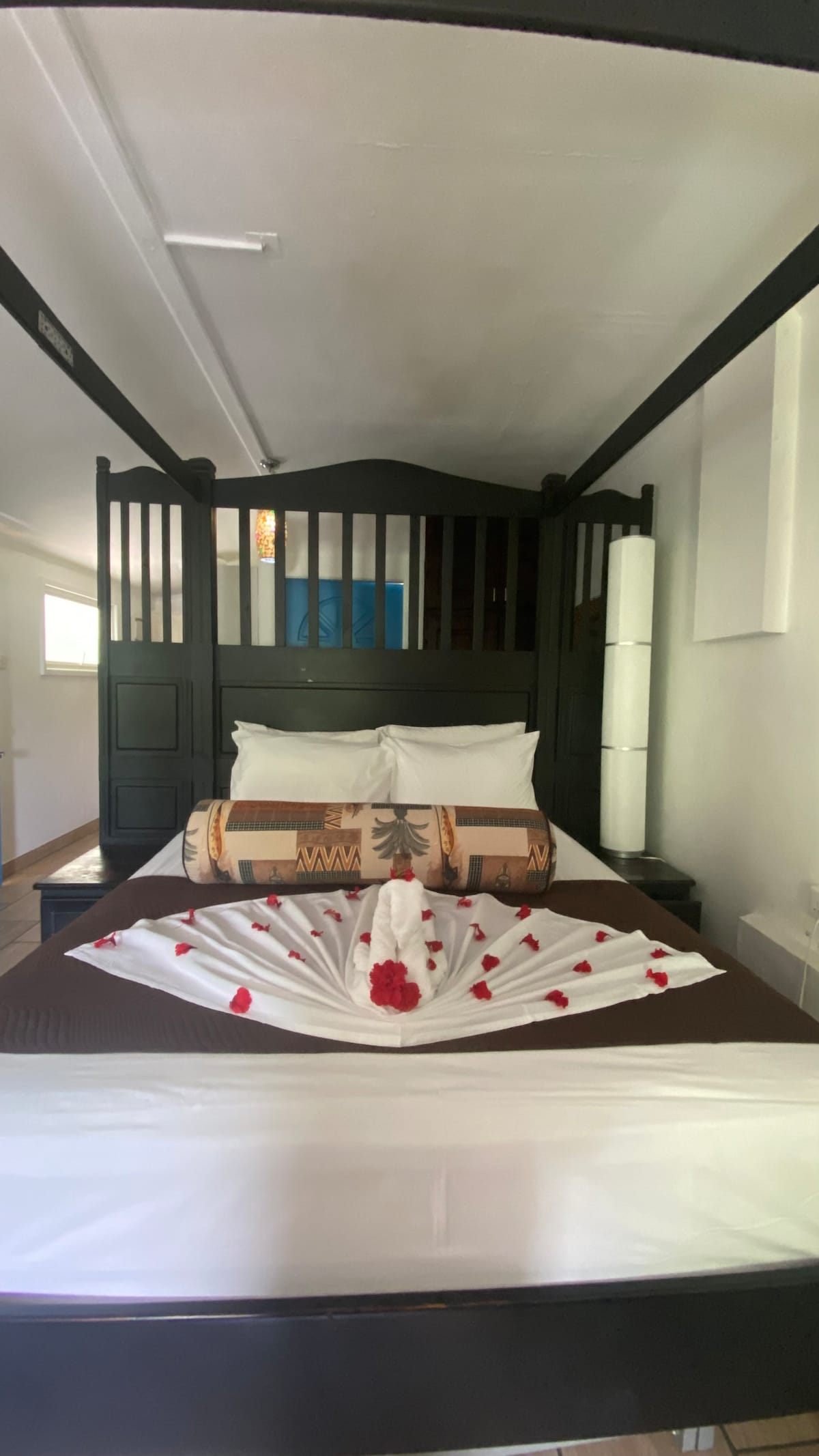 Takamaka tree villa overlooking tropical jungle , five minutes walk to the beach, the villa is Self catering, with private bathroom and fitted kitchen, with wooden patio overlooking garden. The villa is on 3 metre wooden pillars. Its a 50 metre walk with steps from the main car park. Guest carry own luggage. A five minutes walk will take you to 2 grocery stores, beach, bus stops, dive centre, cafeteria, restaurants and take away food. Villa is not suitable for children under 6 yrs old.