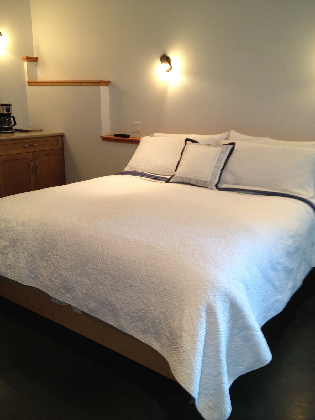 1 di 3 unità in stile monolocale sopra il garage. Nuovissimi letti king-size Endy. Balcone semi-privato e cortile anteriore. Bagno completo. Mini frigo, forno a microonde, macchina da caffè Keurig, tostapane, bollitore e stoviglie in dotazione. Insieme a prodotti da bagno di alta qualità come shampoo, balsamo, bagnoschiuma, lozione e asciugacapelli. Situato a pochi isolati dal centro città, a 5 minuti a piedi dai negozi locali e a 2 minuti a piedi dalle spiagge locali. Immerso tra vecchi sempreverdi. Spesso si avvicinano animali selvatici come cerbiatti, aquile e aironi blu.