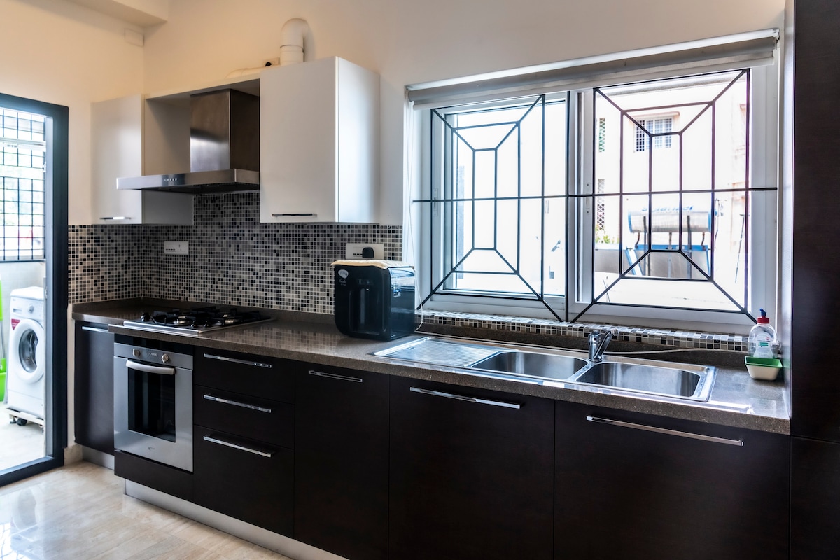 A bright, spacious 4BHK wrapped in greenery—perfect for families, group stays & peaceful work trips. Enjoy cozy bedrooms, balcony coffee moments, foosball/board games, and a fully equipped kitchen for easy, comfortable stays. Clean, calm and inviting—designed for a restful experience. Includes 65” Smart TV + Netflix, fast Wi-Fi and a sunny green-view balcony. ⚠️ No parties / no loud music. Quiet hours after 10 PM. ⚠️ Only confirmed guests may stay overnight. 🐾 Pets only with prior approval.