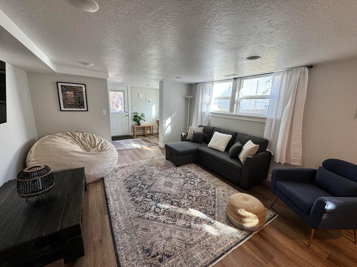Goditi il mio elegante e accogliente duplex che ho appena finito di ristrutturare! Questo è il livello inferiore del seminterrato. C'è un piccolo bar con piano di lavoro in granito, forno a microonde, mini frigo e macchina da caffè Keurig. Soggiorno con smart TV. Cabina doccia e internet ad alta velocità! Ideale per una persona sola o una coppia che non ha intenzione di cucinare. Situato nel centro storico di Pocatello, vicino al sistema di sentieri City Creek. Ideale per escursioni e ciclismo! LEGGI LA DESCRIZIONE COMPLETA e le REGOLE DELLA CASA prima di prenotare, per un soggiorno di successo!