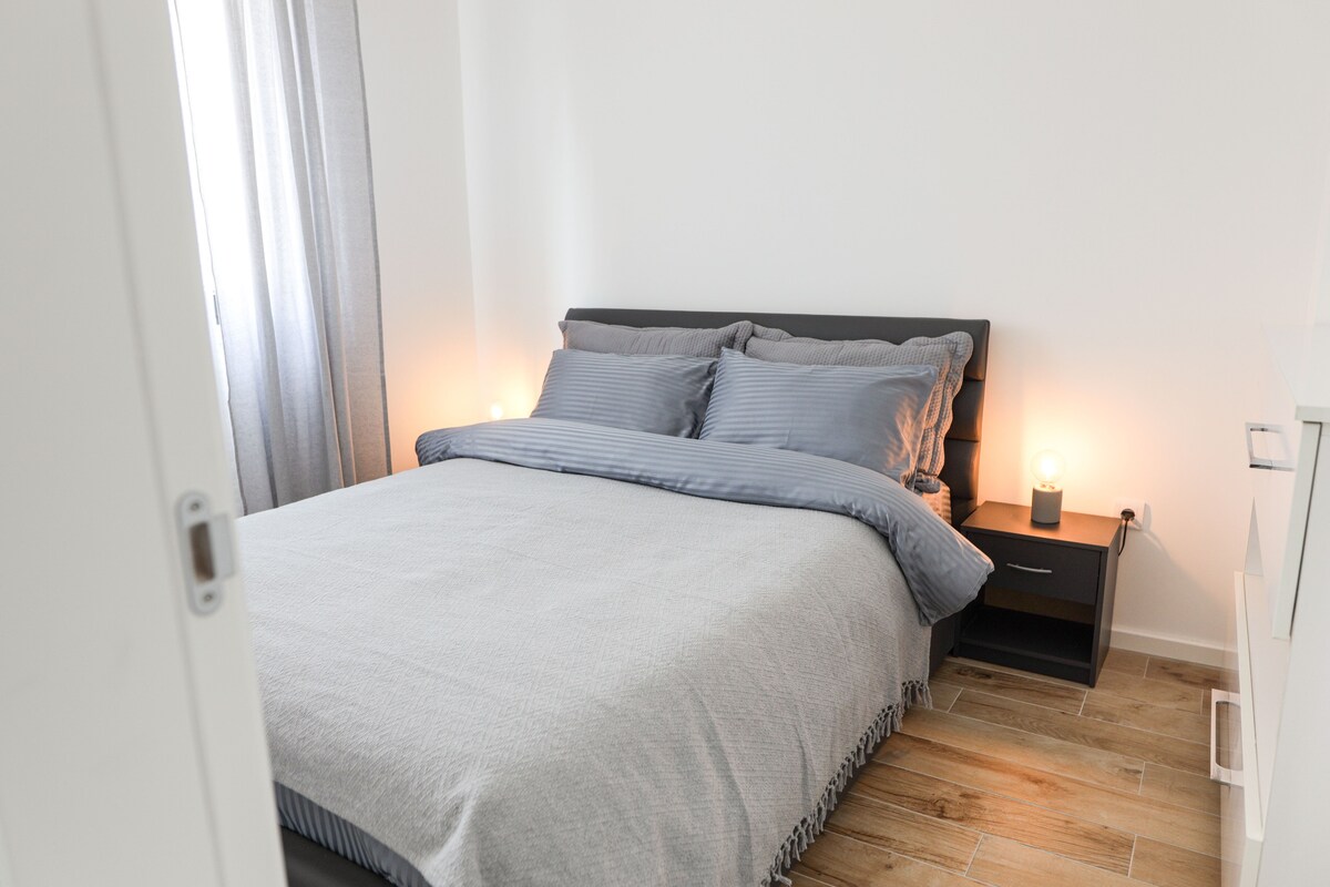 L'appartamento è completamente ristrutturato qualche mese fa e tutto è nuovissimo. Nella camera da letto c'è un ampio e comodo letto matrimoniale e un grande divano letto nel soggiorno. Tutto in una luce a LED discreta. In cucina puoi gustare un moderno fornello a schermo piatto, forno, frigorifero con freezer, lavastoviglie e lavatrice e un grande tavolo da bar. Il bagno è vetrato con ceramiche in marmo, è molto compatto e pulito. Il bagno è dotato di asciugacapelli, asciugamani, set per l'igiene.