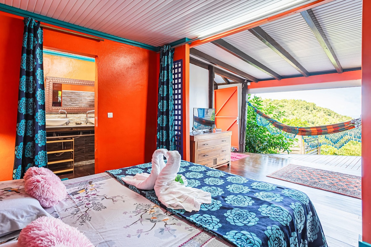 Qui sarete come a casa vostra. Benvenuti nel vostro piccolo angolo di paradiso immerso nel cuore della bellissima foresta tropicale della nostra proprietà . Con la sua terrazza su palafitte, questo nuovissimo bungalow offre una vista eccezionale sulla baia di Grande Anse. Situato sotto la nostra casa, un piccolo e intimo complesso di 3 bungalow vi aspetta in tranquillità , ogni bungalow è isolato nella sua piccola bolla di verde dove potrete godere appieno della vostra vasca idromassaggio privata.