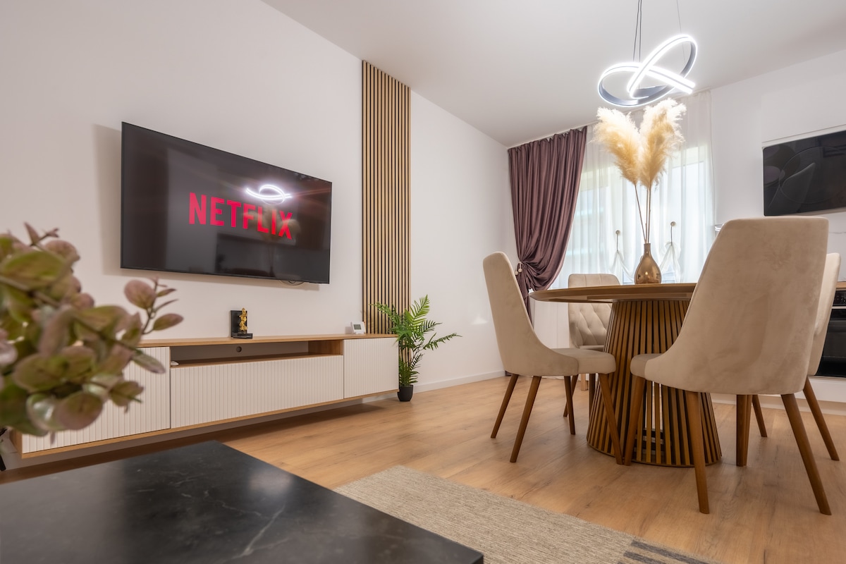 Apartamentul este o alegere perfecta pentru familie sau cupluri. Este situat intr-un cartier nou cu un loc de parcare gratuita la 5 minute de mers pe jos fata de Coresi Mall. Dragi oaspeți Dorim să vă aducem la cunoștință că,în conformitate cu legislația locală,se aplică următoarele taxe: Taxa turistică: 5,00RON/persoană/noapte Taxa de oraș: 7,00RON/persoană/noapte Acestea nu sunt incluse în prețul cazării și vor fi achitate direct gazdei.Vă mulțumim pentru înțelegere și vă așteptăm cu drag!