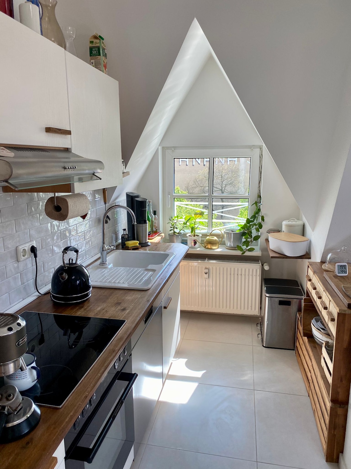 Our light rooftop apartment with its 150 year old wooden beams lies in the middle of a lovely neighbourhood. It comes with a small but stylish kitchen and a luxurious bathroom, equipped with a rain shower and a Finnish sauna. we offer Netflix, cable TV and very fast Internet. Your stay with us will be completely carbon neutraly. The apartment hosts up to three adults or two adults with children.