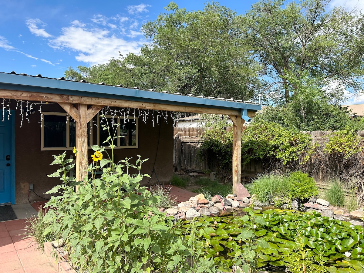 La nostra incantevole casita privata nel centro di Albuquerque è decorata con opere d'arte originali e si trova a pochi passi dal campo da golf del campus nord dell'Università del New Mexico e dall'ospedale/facoltà di legge dell'UNM. L'angolo cottura è dotato di piani di lavoro in granito e illuminazione a LED personalizzata. Abbiamo un giardino paesaggistico privato con aree salotto per godersi colibrì e corridori della strada. Wi-Fi e TV via cavo inclusi NESSUN COSTO DI PULIZIA.