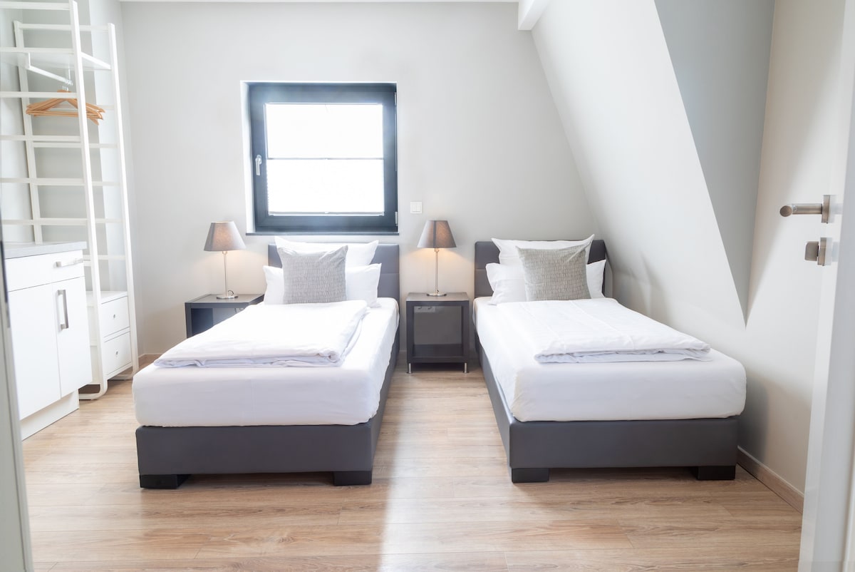 Le nostre camere possono essere utilizzate come camere singole o doppie. Hanno una dimensione di 20 metri quadrati, hanno letti a molle di alta qualità e due cuscini a persona. Tutte le camere doppie sono dotate di bagno con doccia/WC e balcone, che invita a soffermarsi con un bicchiere di vino, soprattutto in serata. Nelle camere doppie, un caffè o un tè di benvenuto è a tua disposizione per prepararti nella cucina del caffè. La colazione non è inclusa nel prezzo, ma può essere prenotata separatamente per 15 euro a persona.