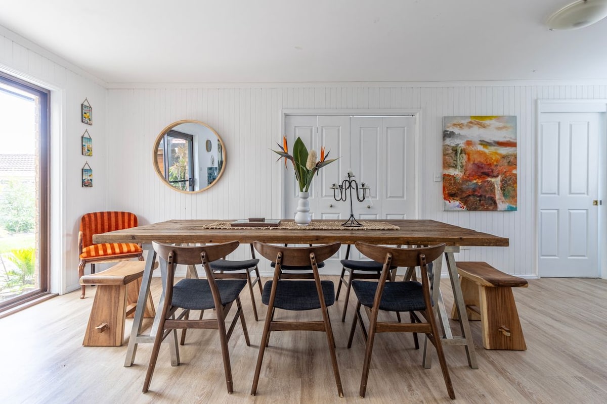 Cottage in stile retrò molto spazioso e super rilassato. Pieno di tesori di viaggio mescolati a oggetti retrò funky e funzionali. A breve distanza in auto da tutte le favolose spiagge, villaggi e parchi nazionali della baia di Jervis. Il cottage è immerso tra imponenti alberi della gomma e circondato da un giardino tropicale commestibile, con un'enfasi sui principi della permacultura, tra cui allevamenti di vermi e stagni per rane. Oggetti riciclati e riutilizzati sono stati utilizzati per creare arte da giardino e per creare un'atmosfera che unisce Byron e Bali.