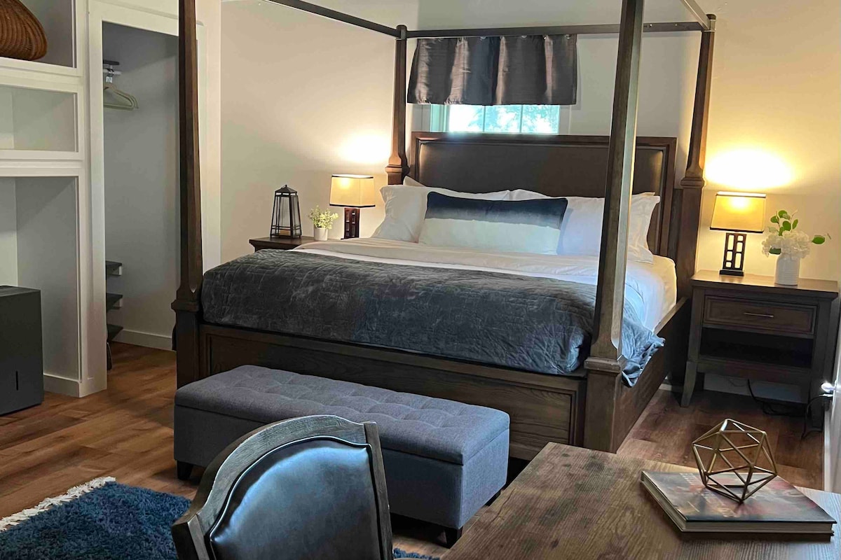 Tucked away on a peaceful working llama retreat—voted the #3 stay in the state of Michigan—this charming efficiency suite offers a cozy retreat surrounded by nature. The thoughtfully designed space features ample seating for relaxing after a day outdoors with a convenient kitchenette. Step outside to not one, but two private gardens. A truly unique and tranquil getaway that blends comfort with award-winning countryside charm.