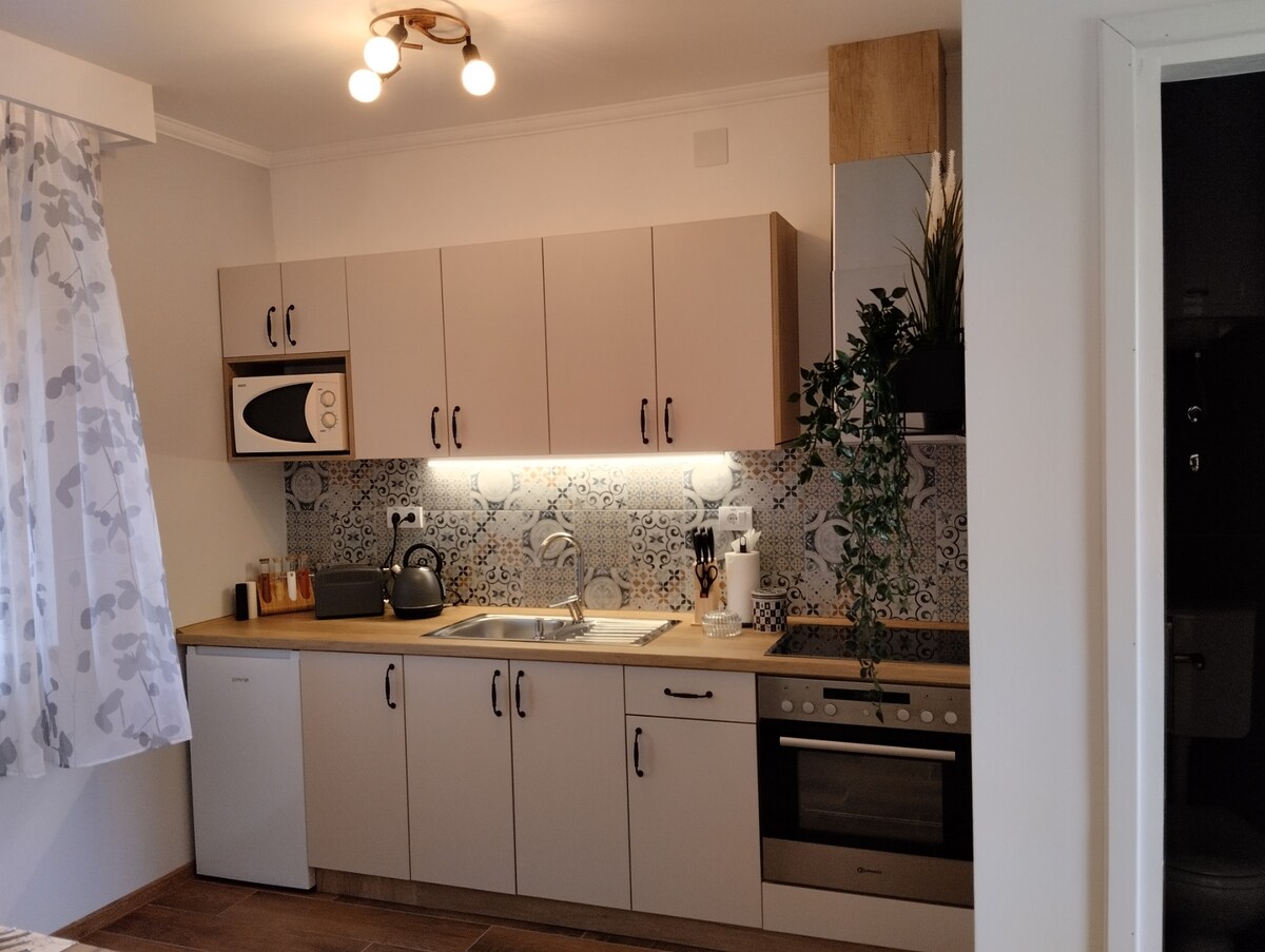 L'appartamento si trova a pochi minuti a piedi dal centro del paese. Nella camera da letto c'è un letto singolo e un letto matrimoniale, TV, aria condizionata, armadio. In cucina c'è un tavolo con 4 sedie, frigo con congelatore, bollitore elettrico, bollitore elettrico, tostapane, tostapane, tostapane, forno a incasso con pannello piatto, utensili e stoviglie per preparare gli alimenti. Il bagno è dotato di doccia e asciugacapelli. Ci sono tre biciclette disponibili per guidare e visitare il paese e l'Alto Danubio. Il cortile è grande e decorato per il massimo divertimento. Sono inoltre disponibili sedie a sdraio.