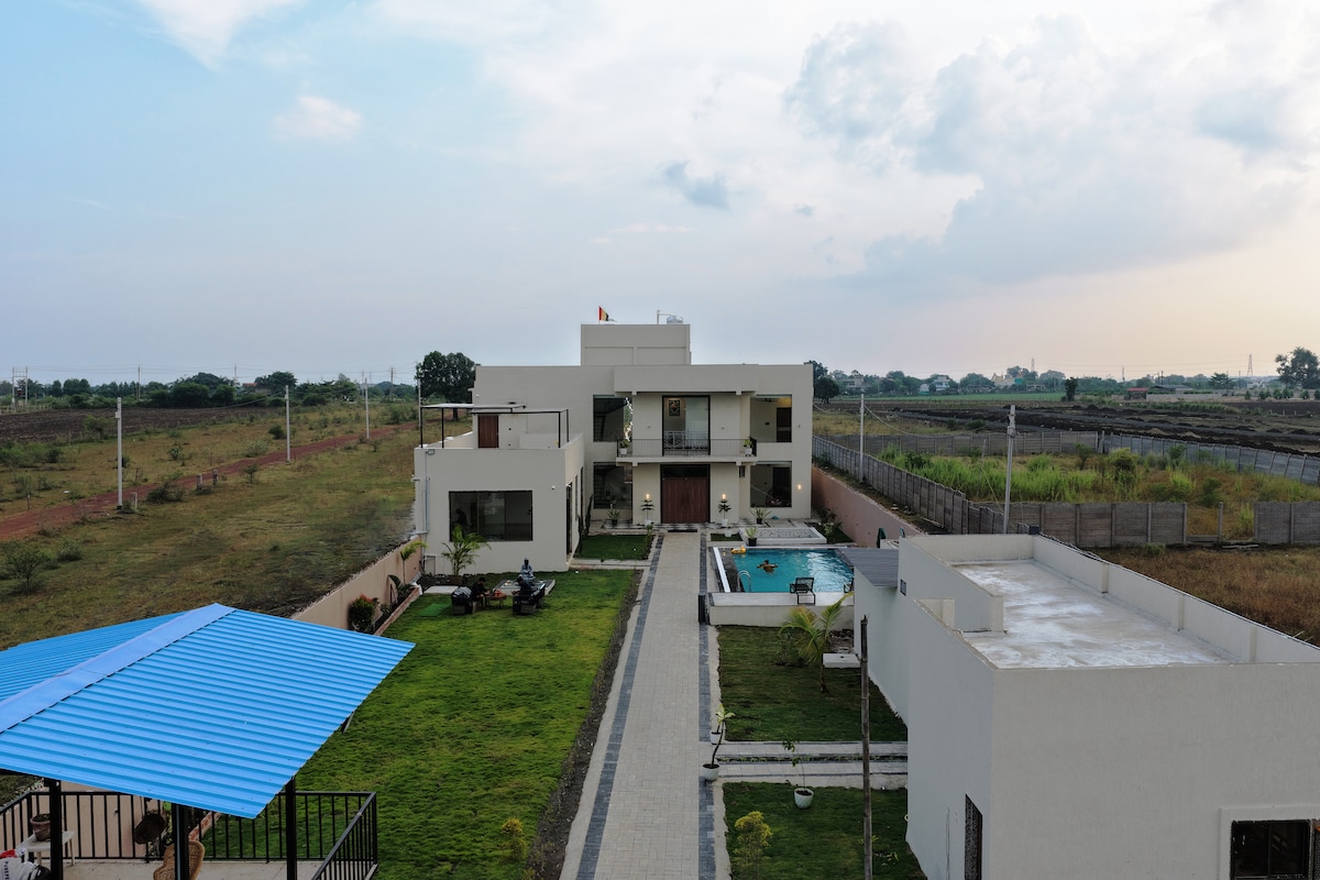 Vyan Villa is a luxury duplex private farmhouse spread across 25,000 sq. ft., perfect for stays, parties, and celebrations. ✔ 3 spacious AC bedrooms with attached bathrooms ✔ King-size beds, balconies & natural light ✔ Private swimming pool with sunbeds ✔ 1000 sq. ft. party hall with club lights & sound ✔ Fully equipped kitchen & dining for 12 ✔ Luxury living lounge seating ✔ In-house theatre with projector ✔ Garden, gazebo & chill zones