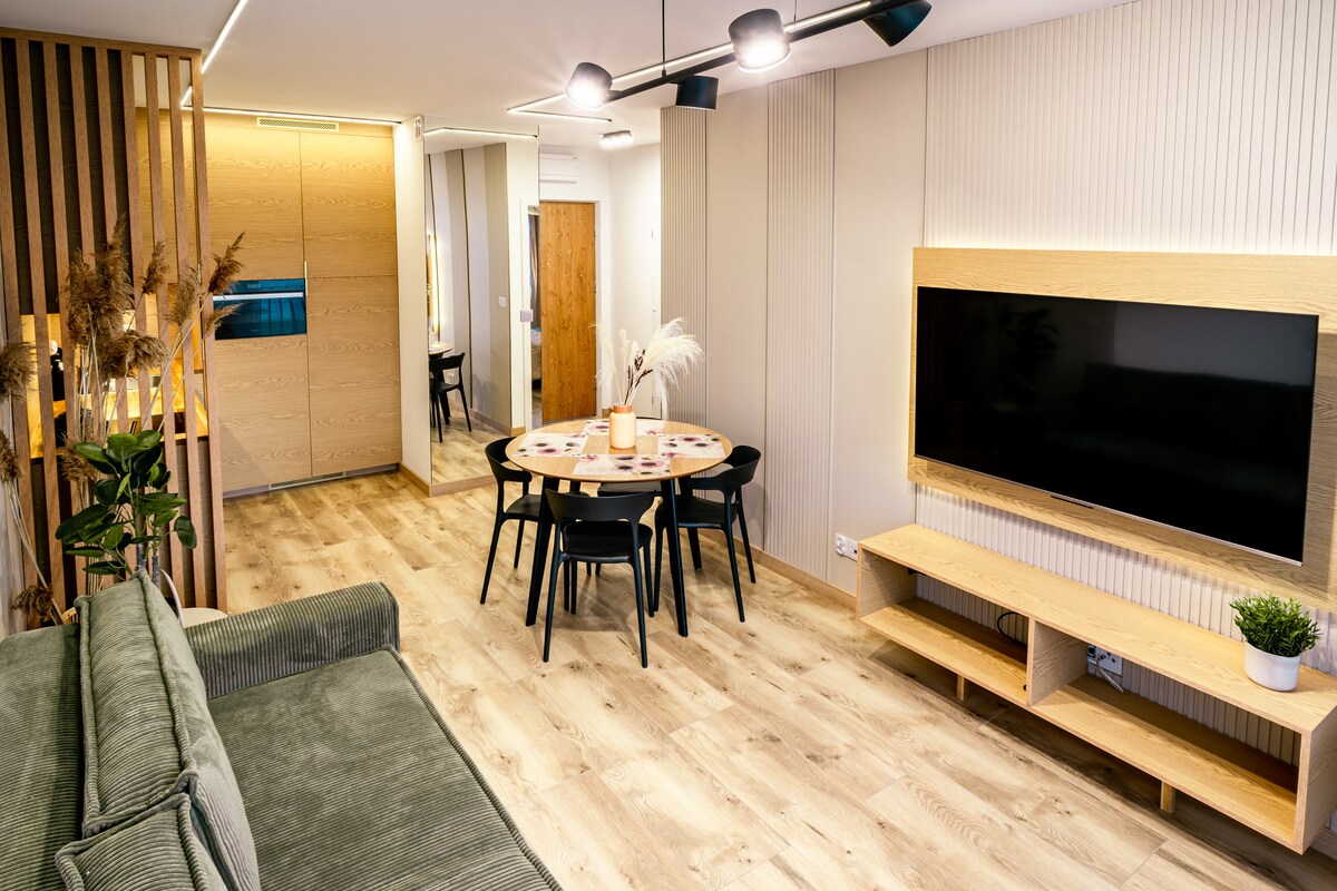 Appartamento di 50 m2, che funge da casa. Situato in un nuovo complesso residenziale, (4° piano, ascensore). Nello stesso condominio ci sono negozi di alimentari, ad es. Żabka. L'appartamento è adatto per 4 persone. Si compone di soggiorno con cucina, camera da letto, ingresso, bagno con doccia. Tutte le camere sono completamente attrezzate (frigorifero, lavastoviglie, forno, piano cottura a induzione, bollitore, lavatrice, tv 55 pollici, ferro da stiro, asciugacapelli, asciugamani). Nell'appartamento è vietato organizzare feste.